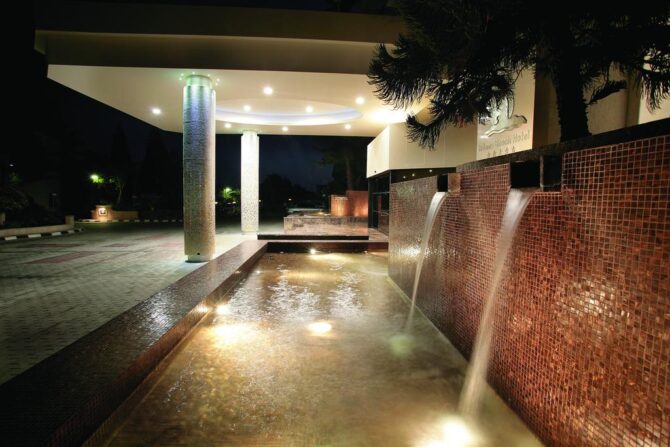 Всего здесь имеется пять водных пулов. Во многих из них есть джакузи, огороженные лягушачьи участки для малышни. Помимо этого, котлованы соединяет так называемая ленивая река. Узкий длинный извивающийся водоем, соединяющий несколько отдельных котлованов. Через ленивую реку есть несколько изящных мостиков. В большой искусственный водоем спускаются две высокие горки, одна – открытая, другая – закрытая. Если этих горок недостаточно, в паре километрах отсюда есть аквапарк. В некоторых комнатах крыла Делюкс есть свой бассейн, с выходом в него с террасы. Один водоем крытый, располагается в первом корпусе.