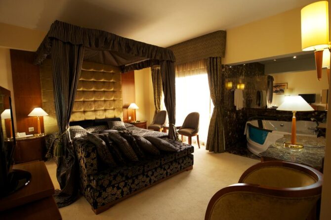 - Полулюксы для новобрачных обустроены огромной кроватью и джакузи в комнате.