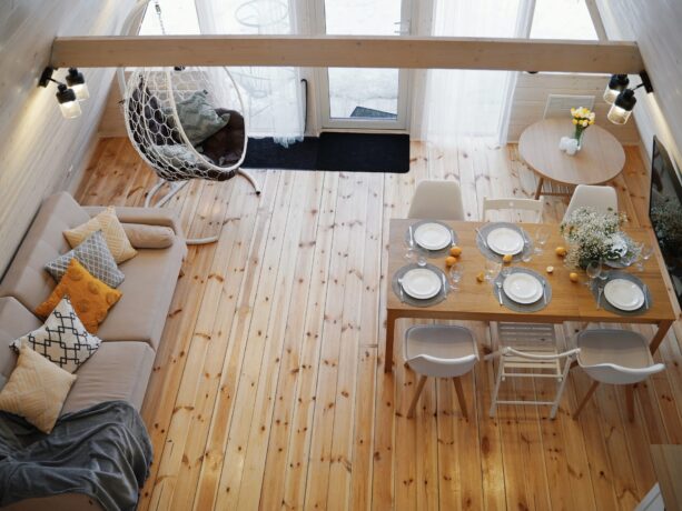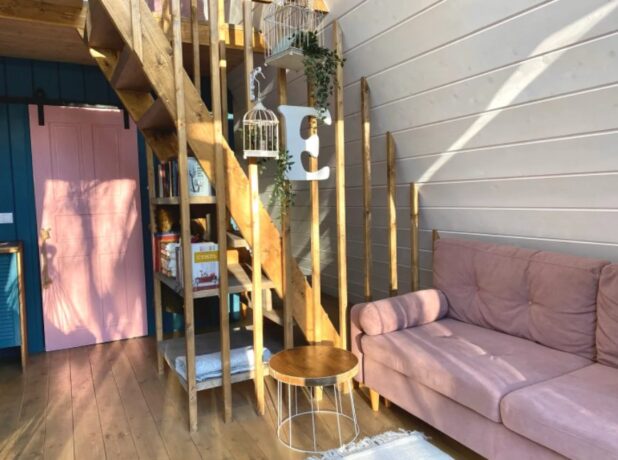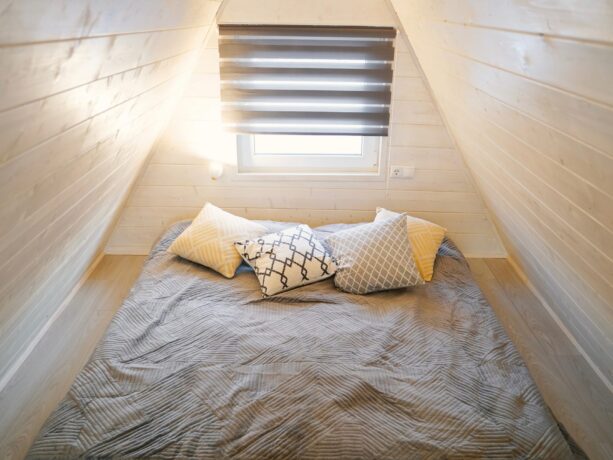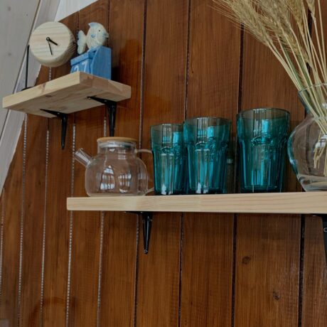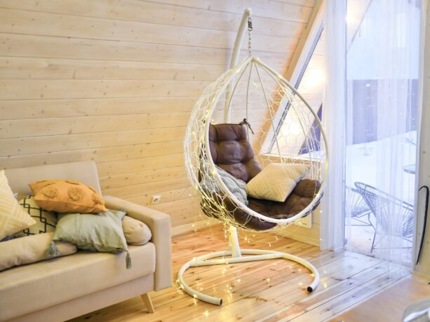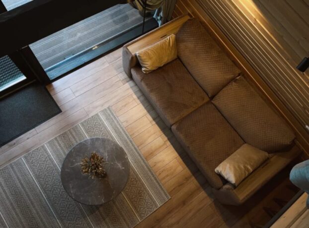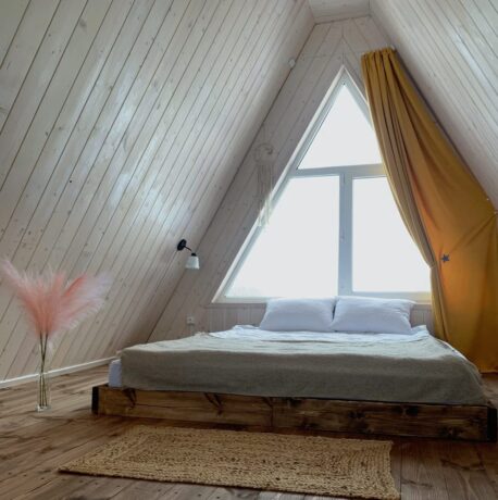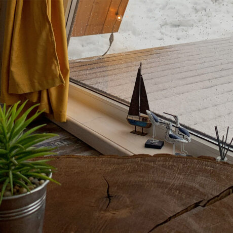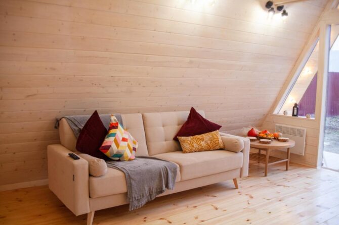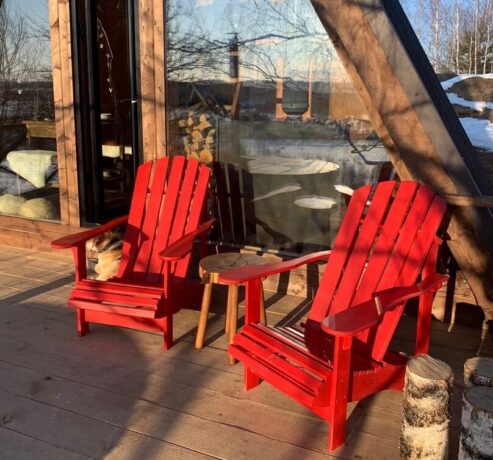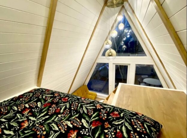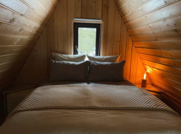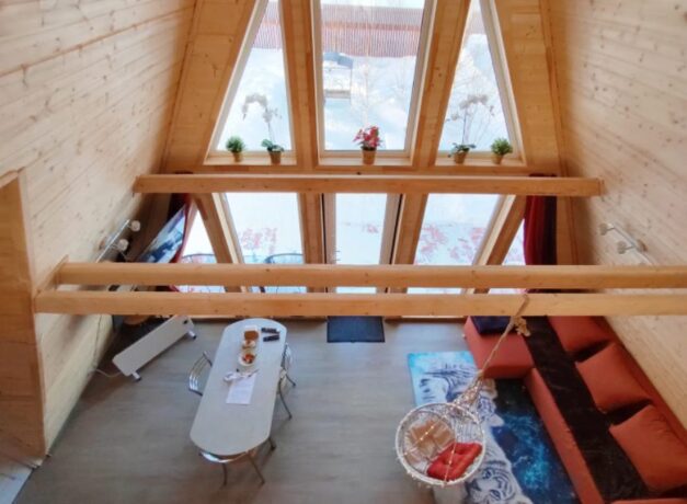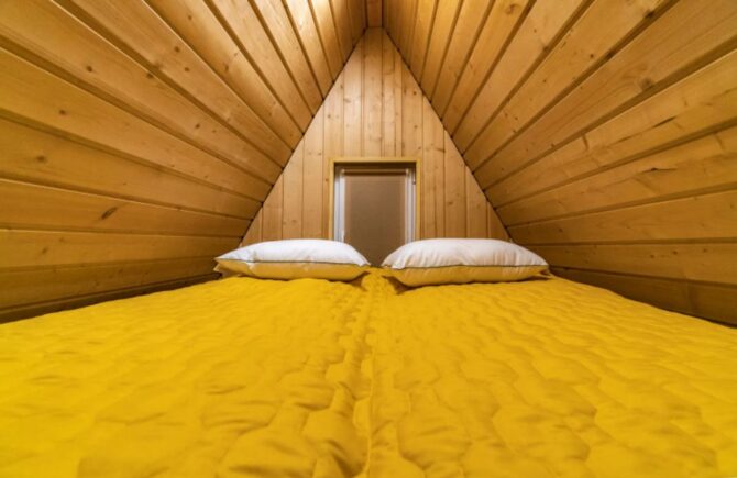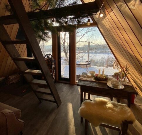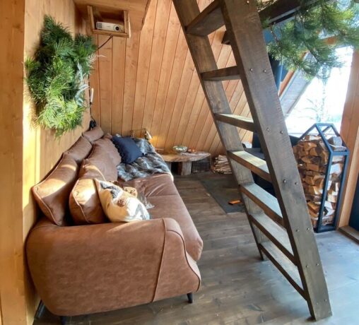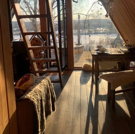Этот А-образный дом поражает своими природными интерьерами начиная с самого входа. На террасе уже установлена добротная деревянная мебель, а под настилом уложены поленья для будущих дров. Внутреннее пространство полностью отделано деревом, даже мебель изготовлена из массива. Владельцы позаботились о том, что гостям хорошо спалось на большом матрасе Bluesleep и белоснежном 100% хлопковом белье.