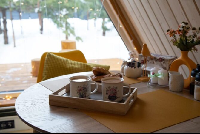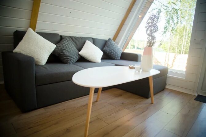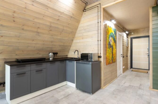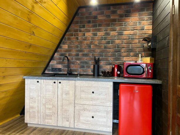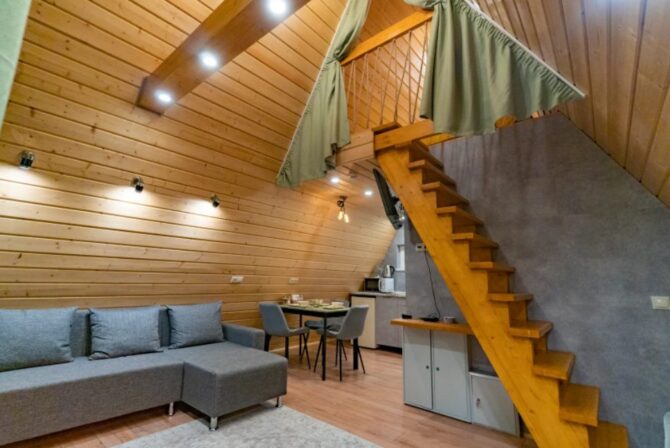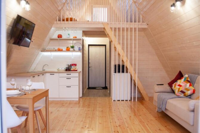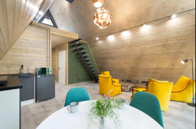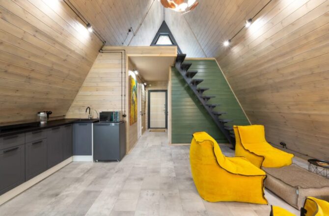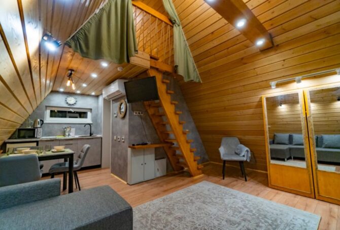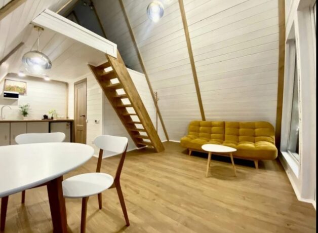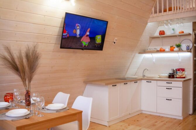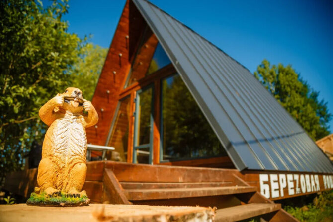 Эко отели пользуются огромной популярностью у москвичей и гостей столицы. В апартаментах Berloga Country Resort для проживания предлагаются разные варианты домов, в том числе и афрейм. «Persey» — благоустроенный А-образный домик, готовый принять гостей в любое время года. Перед входом находится просторная терраса, на которой летом устанавливается садовая мебель, а зимой можно оставить лыжи, санки, тюбинги. Внутри сразу за панорамными окнами размещена уютная гостиная. За ней – кухонно-обеденная зона на четверых. В домике будет сложно разместиться большей компанией, не хватит спальных мест. Для приготовления пищи имеется всё необходимое: двухкомфорочная плита, микроволновка, чайная станция, кофейник, кастрюли, сковородки. Комплект посуды рассчитан на четверых. Во дворе установлен мангал.
