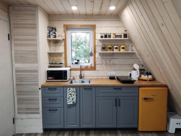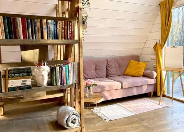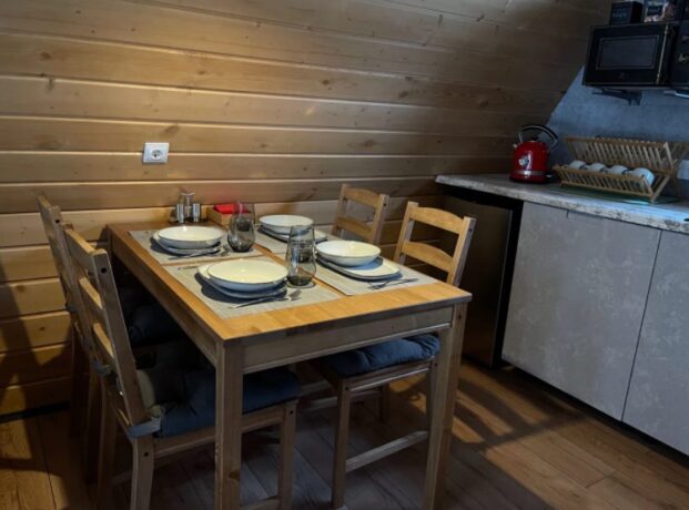 Еще один уютный афрейм-дом находится на территории дачного некоммерческого товарищества «Новинки». При входе в помещение обустроена обеденная зона с панорамным видом на природу. За обеденным столом могут разместиться 4 гостя. Для ночлега подготовлены 2 двуспальные кровати. Любителей понежиться в горячей воде ждет настоящая ванна. Кухня полностью оборудована, есть бытовая техника, посуда, специи и масла. На второй ярус дома ведет деревянная лестница без перил. На участке растут березы, поэтому гости почувствуют себя живущими в шалаше, установленном на лоне природы. На просторной открытой террасе можно встречать рассвет и провожать закат с чашкой кофе или чая в руках.
