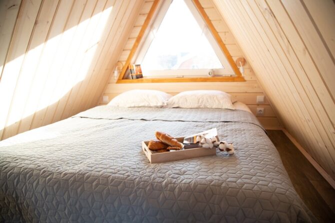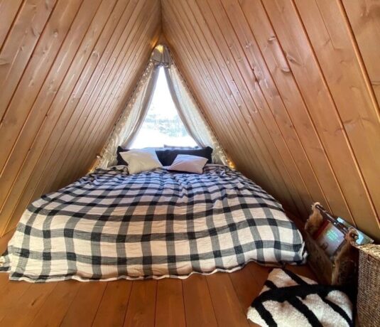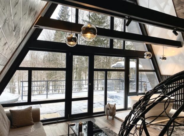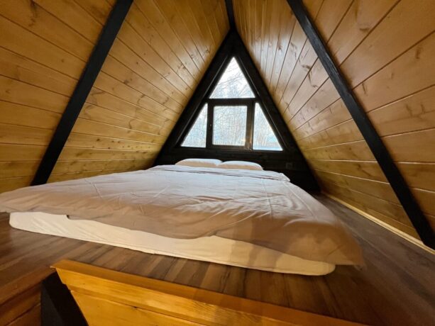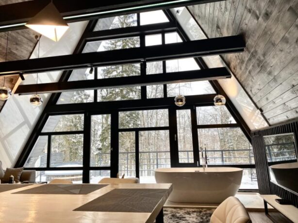 Афрейм-дома могут посоперничать по фешенебельности с номерами категории люкс. Ярким примером является вилла Good Karma «A-Frame». Владельцы предлагают провести время в уютной обстановке, выполненной в скандинавском стиле, принять ванну с панорамным видом на еловый лес или искупаться в горячем чане фурако прямо на террасе. Одна из частей дома приспособлена под финскую сауну. Спальня с двухместной кроватью расположена на втором ярусе, к которому ведет удобная лестница. Еще два гостя могут расположиться на диване в гостиной.