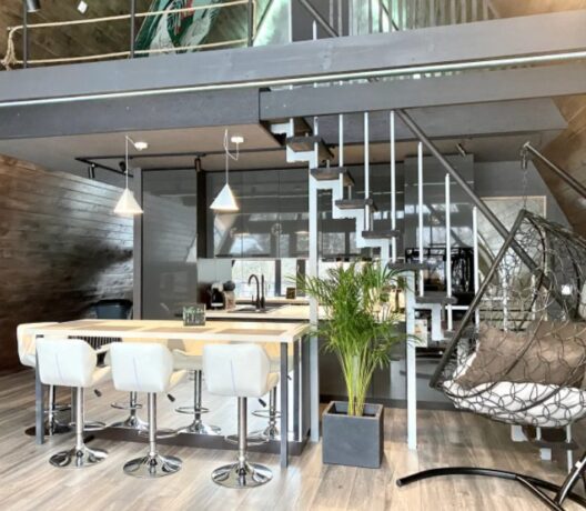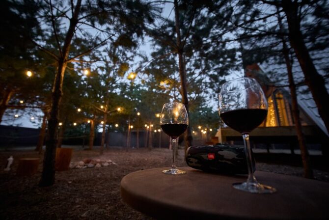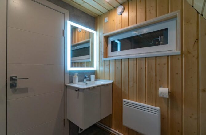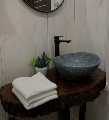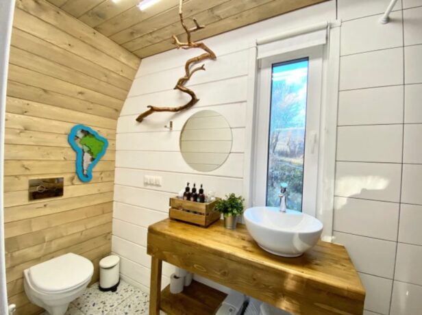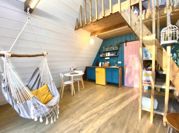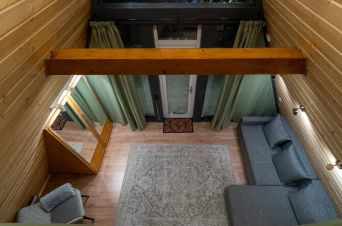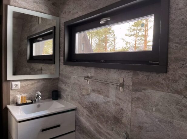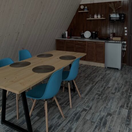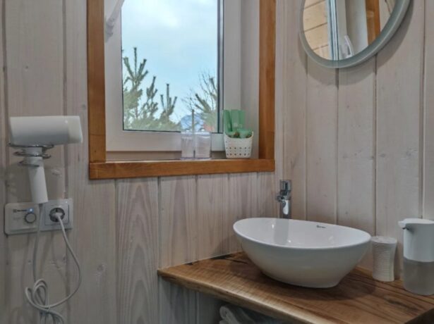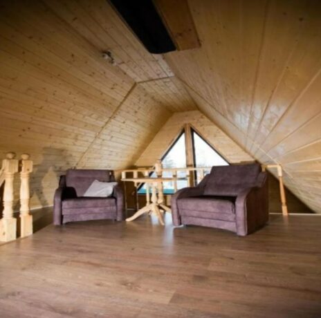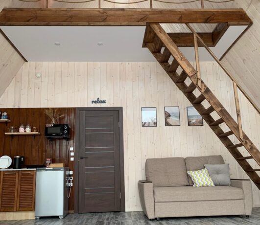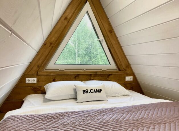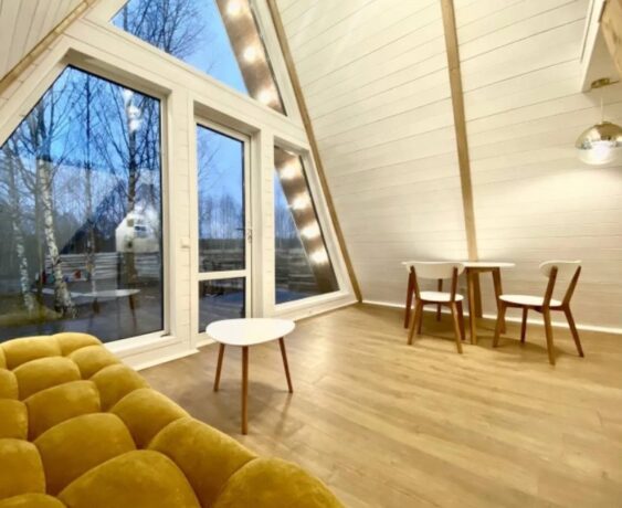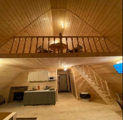 Гестхаус оснащен системой «Умный дом» с голосовым помощником. Он находится на удалении от проезжей части недалеко от живописного озера. Планировка аналогичная другим афреймам – два яруса, наверху спальня для двоих, двуспальный диван установлен в гостиной, все спальные места с ортопедическими матрасами. Кухня, санузел, обеденная зона и лаундж оборудованы на первом этаже. По всему дому проведена система теплых полов. Перед входом имеется терраса, во дворе – мангал. Всего в наличии два благоустроенных «шалаша», которые могут арендовать компания друзей для совместного отдыха.