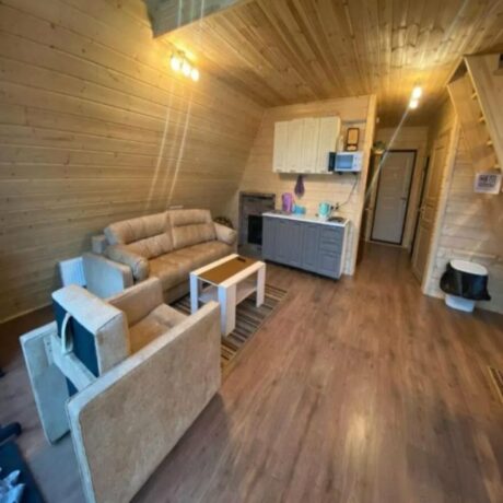 Внутри домика обустроены гостиная и обеденная зоны, спальня на втором этаже, ванная комната с туалетом. За дополнительную плату можно попариться в сауне. Добраться до афрейма можно на автомобиле или общественном транспорте. От остановки до объекта ведет асфальтированная дорожка. Магазины, аптека находятся в 2-х км от дома. Работает доставка еды из кафе и ресторанов г. Домодедово. Пешком или на машине можно добраться до леса, в котором летом полно грибов и ягод, а зимой проложены лыжные трассы. Купаться можно на карьерах, которые также находятся в шаговой доступности.