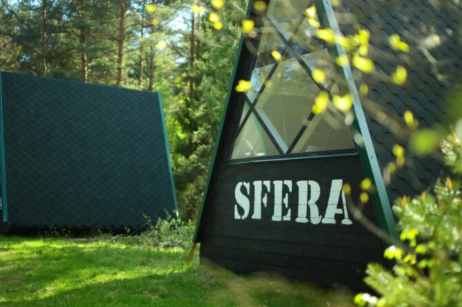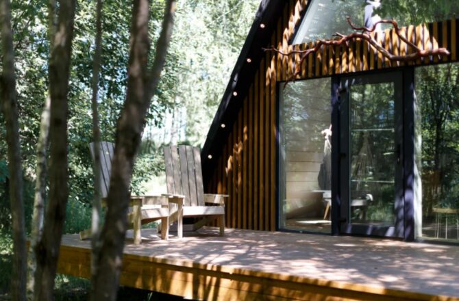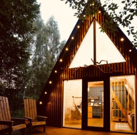 Афрейм-дом находится в коттеджном поселке «Сосновые озера». Он разделен на два яруса и может разместить четырех гостей. Обе спальни расположены под треугольным сводом, отделены друг от друга деревянной стенкой. Владельцы позаботились о полноценном сне своих постояльцев, установив на кровати качественные ортопедические матрасы. На первом ярусе дома установлены кухонный гарнитур (нижние шкафы), бытовая техника, в том числе стиральная машина, мойка. Санузел с душевым отсеком и лейкой для тропического душа обустроен в глубине дома. В просторной гостиной есть обеденный стол, лаундж с удобными низкими креслами для вечерних посиделок. На террасе находится еще одна зона отдыха с мягкой мебелью. Во дворе между деревьями летом натягивается гамак.