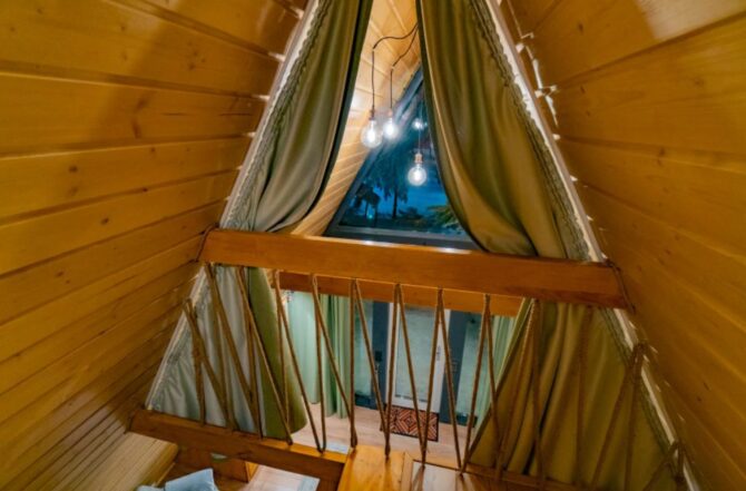 Сам афрейм-домик построен в райском уголке на территории парка «Плещеево озеро» среди хвойных деревьев. На втором ярусе под треугольным сводом находится двуспальное место. Еще две односпальные кровати расположены на первом этаже. Во дворе установлен мангал с запасом дров, большой стол на 10 человек (остаться на ночь могут только четверо). Предусмотрен биотуалет, малышам выдается горшок. Если компания друзей приезжает в эко кемпинг только на шашлыки, то дополнительно может быть установлен садовый туалет.