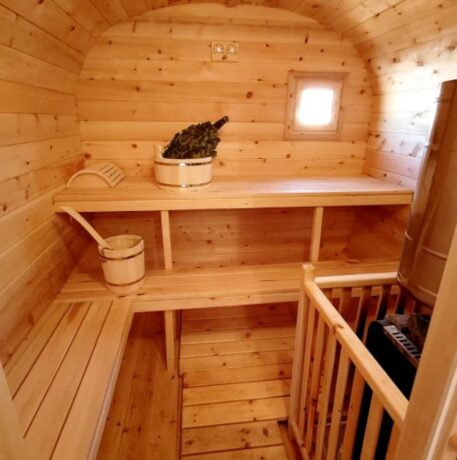Небольшой афрейм-дом площадью 42 кв. м рассчитан на прием 3 гостей. Это уникальное место пользуется спросом у москвичей, семей с детьми, романтически настроенных пар. Шале построено на холме, откуда открывается вид на лес и долину реки Серена. За всем великолепием дикой природы можно наблюдать, принимая термальные процедуры в горячей купели фурако, установленной на террасе. Чан изготовлен из лиственницы и имеет диаметр 2 метра. Услуга по растопке платная, зато время пользования не ограничено. Хозяева оставляют запас дров.