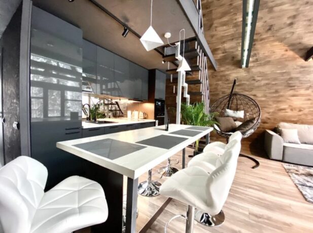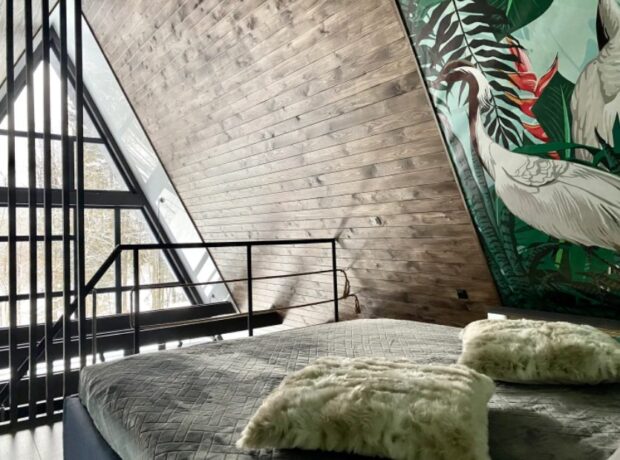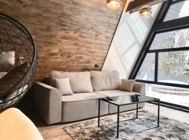 Привлекательное шале построено на ухоженной зеленой территории. Ландшафтные дизайнеры придумали проект, в котором дом действительно выглядит как шалаш, установленный посреди леса. Как таковой террасы при входе нет. Ее заменяют укромные уголки, обустроенные во дворе. К услугам гостей: обеденный стол и лавки, зона барбекю, лаундж с шезлонгами, баня «Квадро-бочка», горячая купель с подсветкой. Спальные места рассчитаны на 6 человек. Основная спальня-лофт занимает весь 2-й этаж, дополнительный диван находится в гостиной на первом ярусе дома.