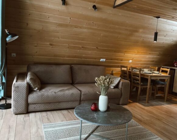 Внутри дома для постояльцев установлены 2 кровати, кухня с набором принадлежностей, специй и сыпучих продуктов, уютный лаундж, печь-камин, обеденный стол. Всё оформлено по-деревенски, в духе гостеприимных альпийских шале. В интерьере использована грубая мебель из массива, шкуры, домашний текстиль. Сборы сухих трав и цветов желают пребывание в доме более атмосферным. Здесь всё создано для того, чтобы отдохнуть от шума городских улиц и офисной суеты.