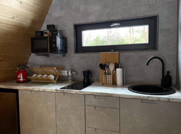 Для приготовления еды оборудована кухня. На террасе возле входа имеется зона барбекю. Шампура и решетки находятся в доме. Хозяева позаботились о поленнице дров и удобной обеденной зоне в гостиной. Для любителей послушать музыку или почитать в комфортной обстановке установлено кресло-кокон с мягкими подушками. Для курения отведено специальное место. По договоренности с владельцем можно привозить домашних питомцев. Максимальное количество гостей – 4 человека.