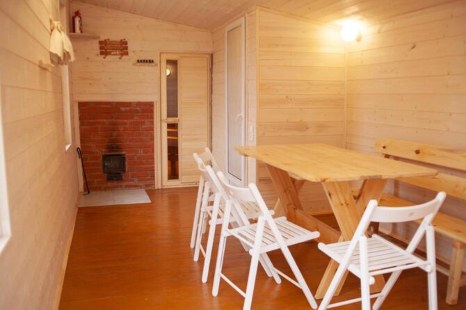 Летом владельцы обустраивают отдельный лаундж под соснами: натягивают гамак, ставят кресло-кокон. Всё делается для комфортного отдыха гостей в любое время года. Поблизости находятся Коняшинские карьеры. На водах можно поплавать на сапбордах.