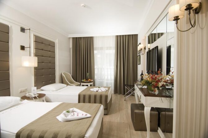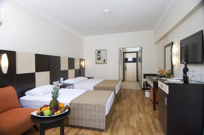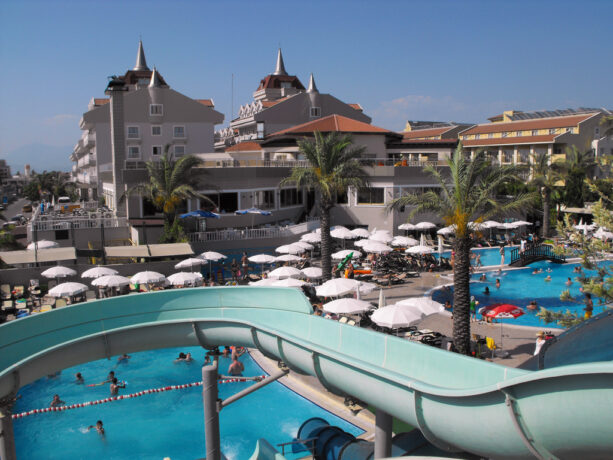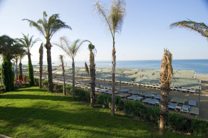 На берегу Средиземного моря расположен отель Андибей Фэймос, во владениях которого пляж, отмеченный Голубым флагом. Это международная награда, которую вручают причалы и пляжи с водой безопасной для купания. Аэропорт Анталия расположен от места в 33 км, куда легко добраться на специальном трансфере.