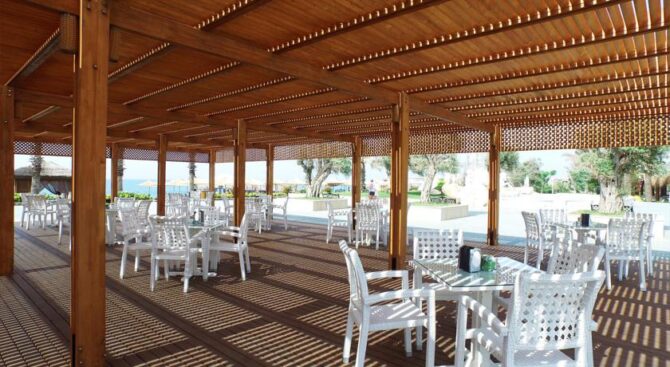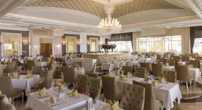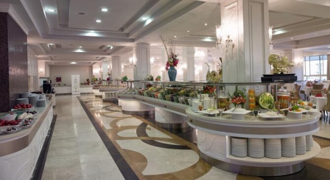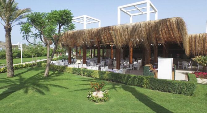 Этот отель порадует широким разнообразием и любителей вкусно покушать, кроме шведских столов, накрываемых в одном из ресторанов, которых на его территории аж семь, любой жилец может, используя меню заказать блюда итальянской, восточной, турецкой и мексиканской кухни. Выбранный шедевр кулинарного искусства могут доставить в номер или беседку, в которой отдыхающий находится в данный момент. Желаете быть более самостоятельным и не зависеть от общественного транспорта — специально для вас имеется прокат авто. На территории отеля есть бесплатная парковка для автомашин.