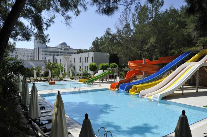 Для всех гостей в свободном доступе есть пять открытых пулов. Среди них один – с морской водой и один – с горками. Помимо открытых, есть еще два крытых водоема. Один – простой в СПА-центре, второй – с подогревом в главном корпусе. На центральном бассейне проводятся Гала-концерты. Раз в две недели он озаряется разнообразной подсветкой и яркими представлениями. С 20.00 пулы закрывают до 06.00, чтобы не мешать постояльцам спать. В СПА-центре есть хаммам, финская сауна, турецкая парная. Можно воспользоваться услугами массажа, скрабирований и обертываний. Также здесь предоставляют услуги салон красоты и парикмахерская.