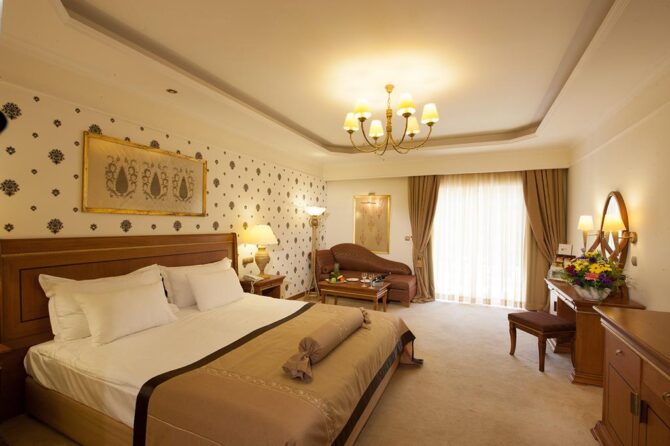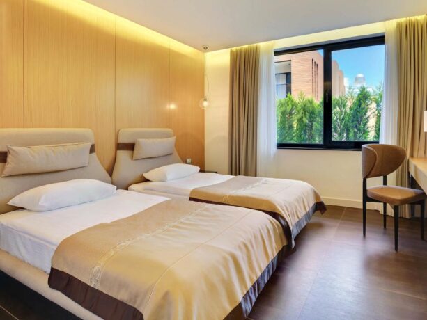 За основным зданием находятся еще несколько многоэтажных корпусов, с видом на сад, бассейн, море и зоопарк. В них тоже пенаты Делюкс. Стандартные комнаты рассчитаны на двоих проживающих, с двумя одноместными или одной двуспальной кроватями. Помимо спальни, — гардероб, ванная комната и балкон.
