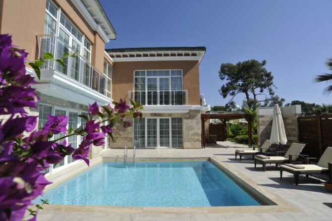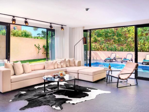 Пять двухэтажных вилл со своим водным пулом, но без подогрева. Они чуть меньше по площади, с двумя спальными, кухней-столовой, гостиной и террасой. Для людей с ограниченными возможностями есть 4 номера. Они находятся в корпусах сегмента Клуб., полностью экипированы и оборудованы с учетом особенностей постояльцев.
