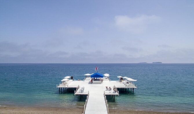 Средиземное море и Таврские горы делают это место райским. Благодаря тому, что здесь располагается бухта, волны небольшие, вода относительно спокойная. Пляж протягивается на 630 метров вдоль побережья. Он песчано-галечный, с пологим входом в море. Здесь есть отдельные участки для отдыха только взрослых и для тех, кто плещется с детьми. На взрослых отделениях могут чувствовать себя уверенно люди, любящие загорать топлес.
