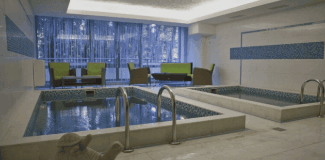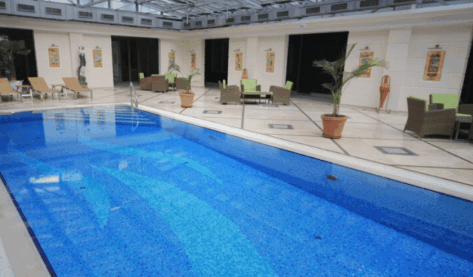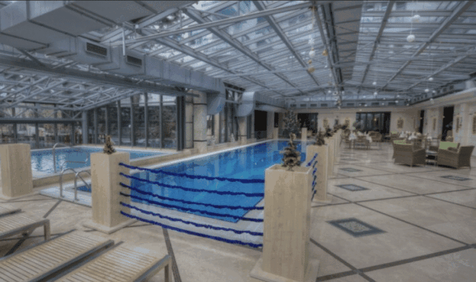 Бассейнов здесь два: большой для взрослых с морской водой и маленький тёплый для детей. Крыша стеклянная, так что пропускает много света. Рядом шезлонги, кадки с декоративными растениями. Бассейн довольно длинный, так что любители поплавать должны остаться довольны. Народу немного, поскольку клубный отель рассчитан на небольшое количество отдыхающих.