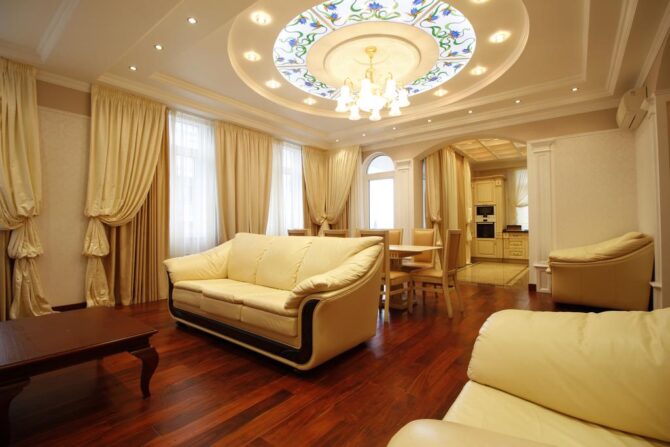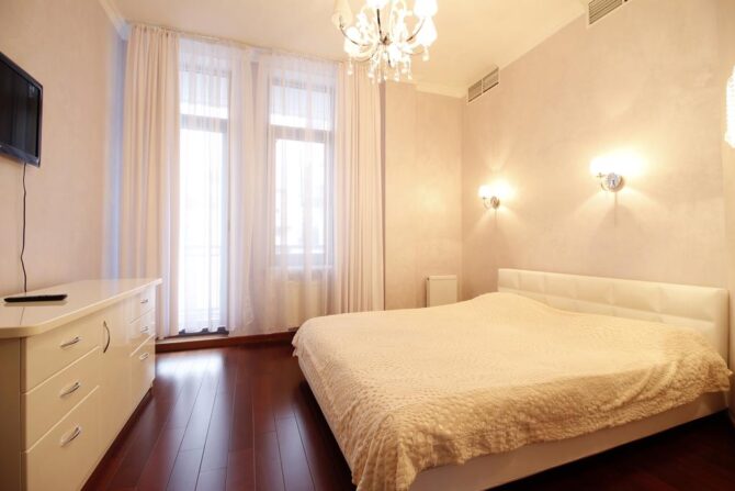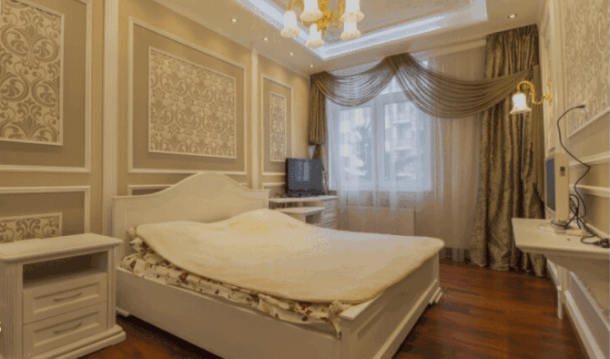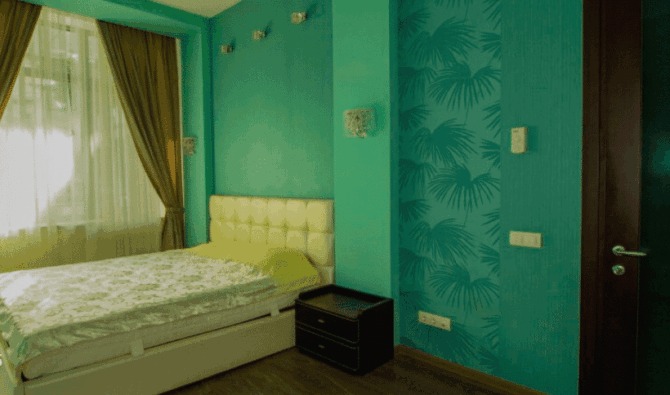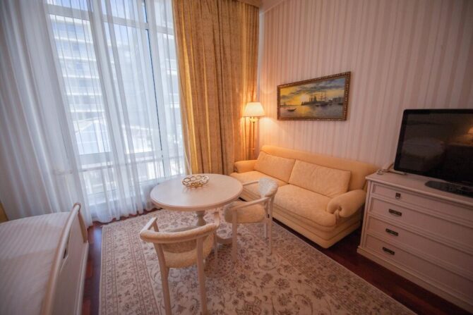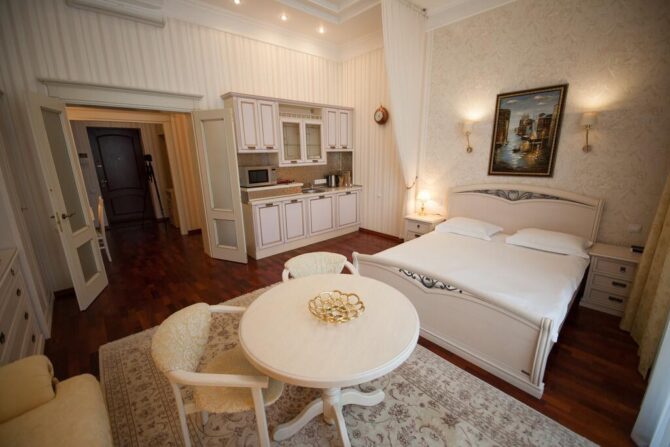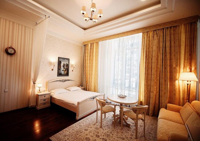Апартаменты с 1 спальней имеют площадь в 110 м2 и зонирование в виде студии: огромная гостиная с встроенной кухней, спальня, большой санузел и балкон. Оснащение: гидромассажная ванна, биде, стиральная машина, кондиционер и TV с кабельным телевидением. Чистое бельё, косметический набор, фен, утюг. Это стандартное оснащение для всех номеров. Ремонт неплохой: стены в светлых тонах, на полу плитка, навесные потолки из ГКЛ, декоративные украшения. Современная мягкая и сборная мебель подобрана в едином стиле. Помещение рассчитано на проживание 3-5 человек.
