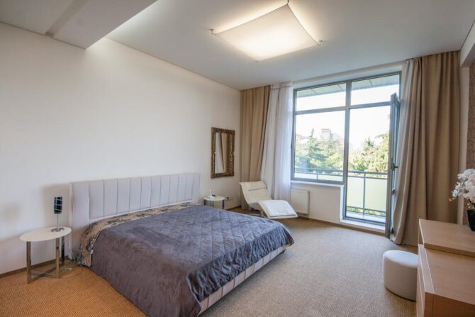Апартаменты 330 м2 будут ещё дешевле, т.к. вмещают 9 человек в 5 комнатах. На одного человека получается 36 м2 стоимостью 2100р в сутки – это в высокий сезон с мая по июль 2021г. Есть и другие варианты планировок, которые отличаются площадью, интерьером, количеством проживающих.