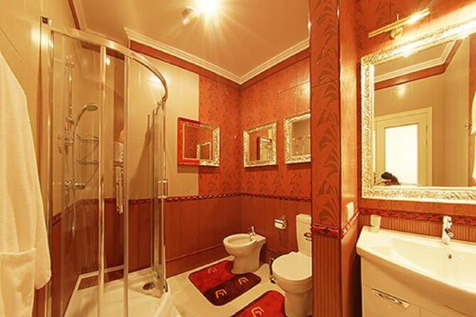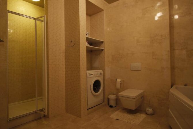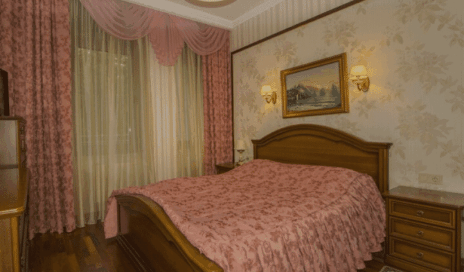 Апартаменты на втором этаже состоят из спальни, гостиной и кухни-столовой. Кроме этого, 2 санузла и 2 балкона. Номер выполнен в стиле обжитых квартир с элементами дизайнерской отделки. В большом санузле есть ванна и душевая кабина. Современная мебель, ковры, подсветка, ниши, навесные потолки составляют цельную композицию, которая выглядит приятно и уютно. Помещение рассчитано на проживание 4 человек.