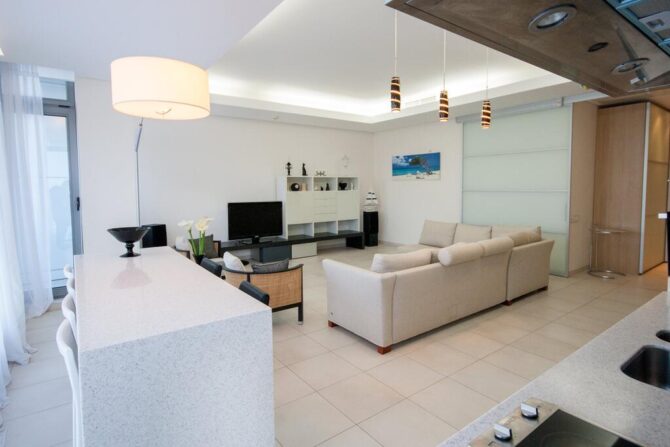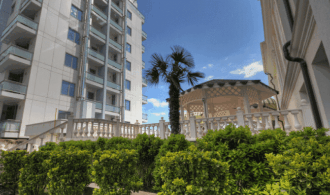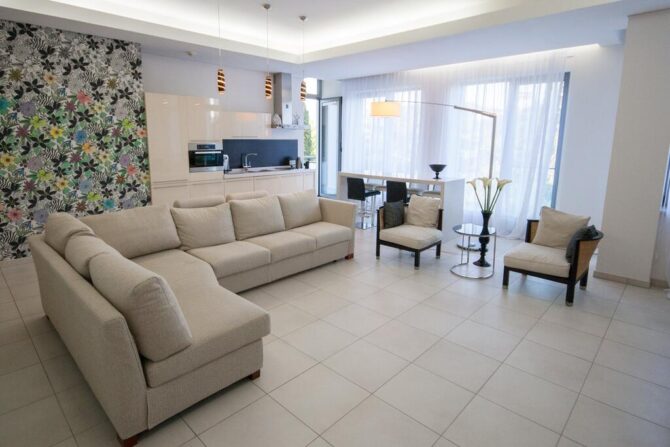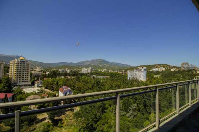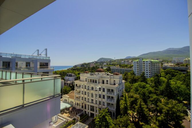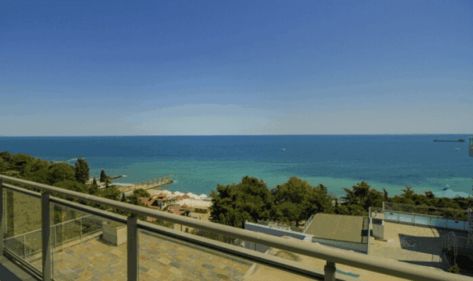 Пентхаус с террасой на 9 этаже – это отличный вариант для отдыха в складчину компанией 4-6 человек. 470 м2 площади включают в себя: две спальни, две гостиной, кухню, две ванной комнаты. Витражные окна по всему периметру открывают шикарный вид на море и панораму побережья. По периметру расположен балкон с поручнями, где можно принимать солнечные ванны, попивать вино и наслаждаться морским бризом.
