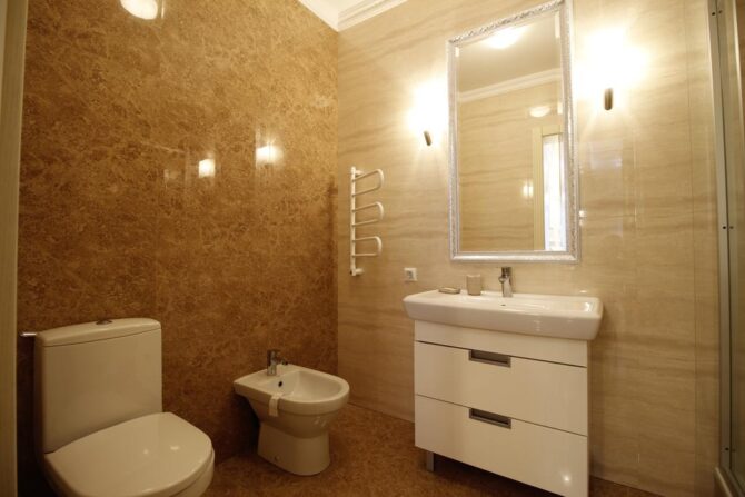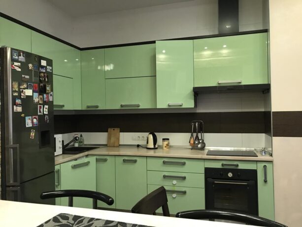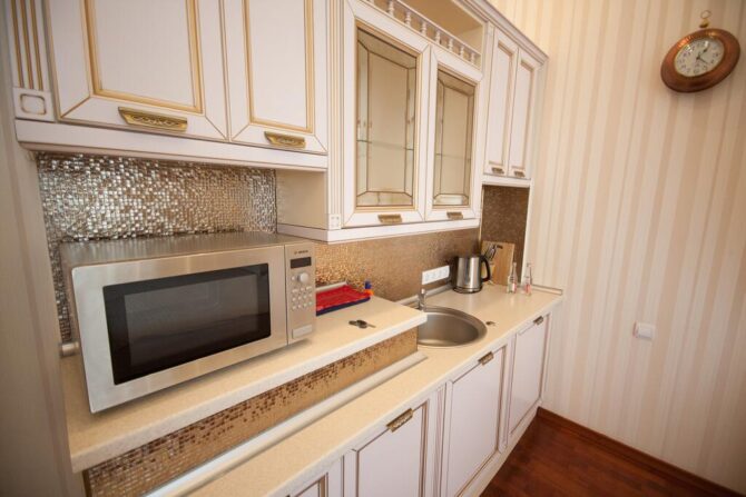 В любом из апартаментов кухня оборудована всем необходимым, благодаря чему можно питаться по-домашнему. Это потребует усилий: закупки, разделки, приготовления пищи. Но будет дешевле в 2-3 раза, нежели питаться в кафешках и ресторанах. На кухне есть мебель, посуда, утварь, керамическая плита и холодильник. Для разогрева блюд предусмотрена микроволновка. Из гаджетов: соковыжималка, электротурка.