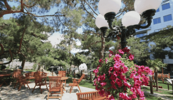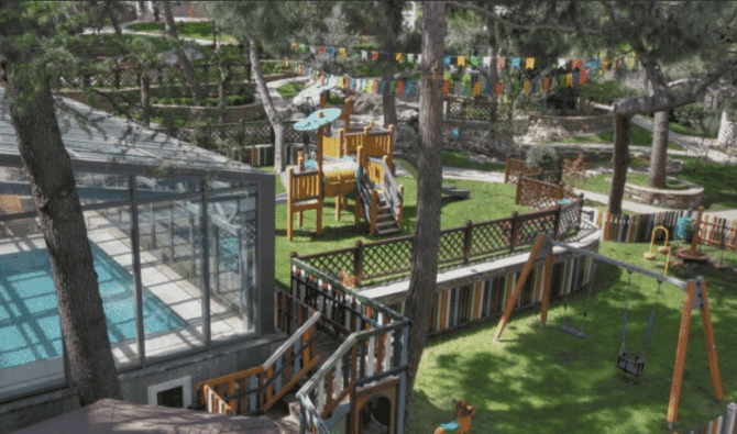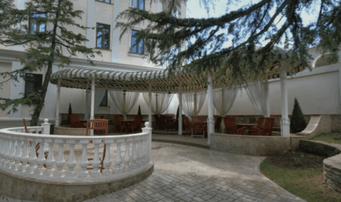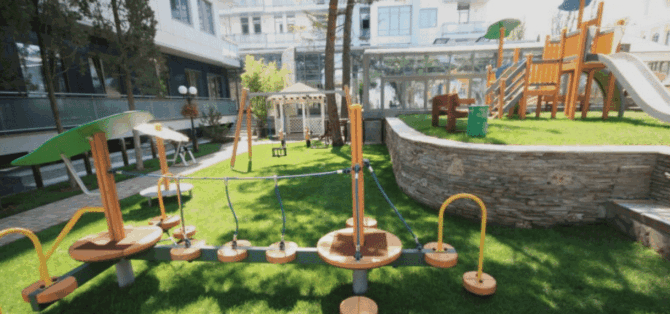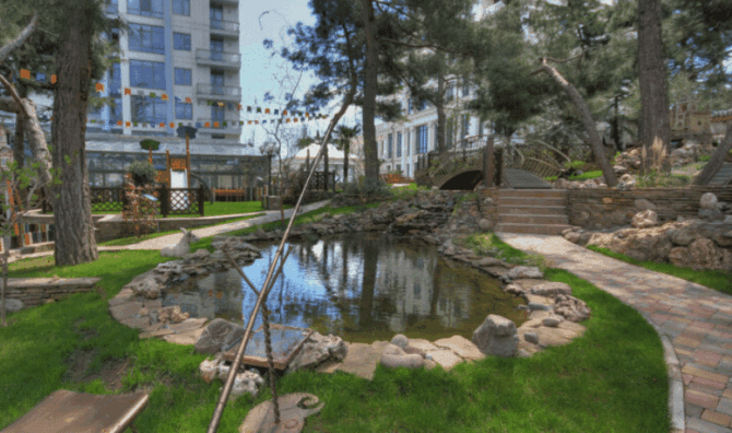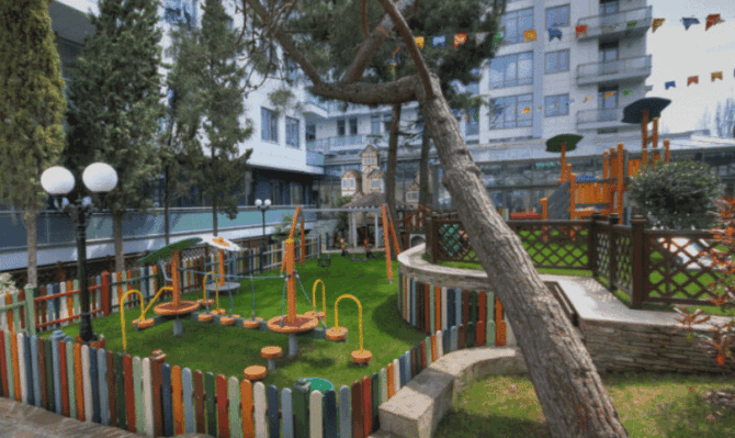 Детская игровая площадка разбита на зелёном газоне: горка, песочница, а рядом лавочки для родителей. Кругом зелень, опрятные дорожки из плитки, ручей и мостик через него. Для любителей активного отдыха оборудован фитнес-центр. Есть бильярд, карточные столы и бар. Спа-центр имеет некоторое количество платных услуг, включая массаж.