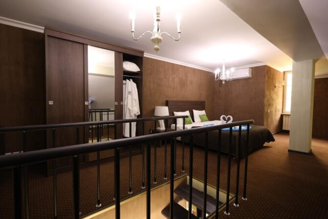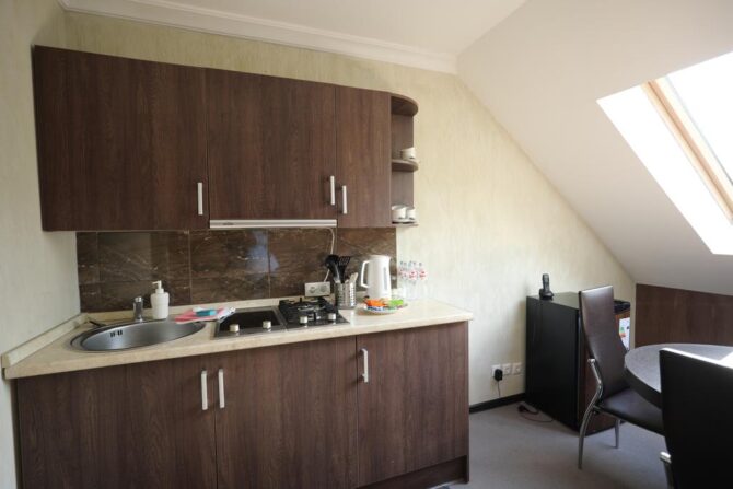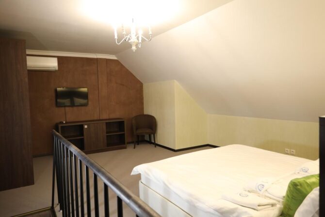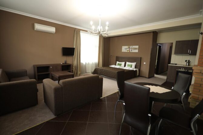 - Люкс с одной спальней рассчитан на двоих. Обычно этот вариант заказывают семейные пары или люди, приезжающие в командировки на длительный срок. Практически однокомнатная студия с кухней, спальной зоной и необходимой для отдыха мебелью. Есть письменный стол и стул.