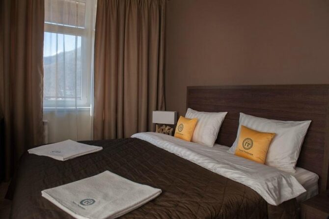 Уютные апартаменты со всеми удобствами и оборудованными кухнями могут одновременно разместить 160 человек. Всего предлагается 65 номеров. Интерьер каждого из них выдержан в альпийском стиле. Приглушенная цветовая гамма, никаких лишних деталей, из декора – живописные инсталляции и живые горные цветы в вазах. Из больших окон открывается вид на Кавказские горы. К сожалению, не все номера имеют балконы. Зато везде чувствуется забота хозяина о своих гостях: мини-бары заполнены, есть наборы для чая/кофе, в сейфах можно хранить документы и личные ценные вещи. На всей территории предоставляется бесплатный доступ к интернету.