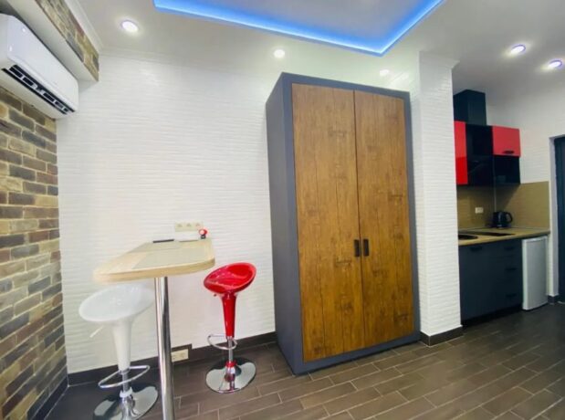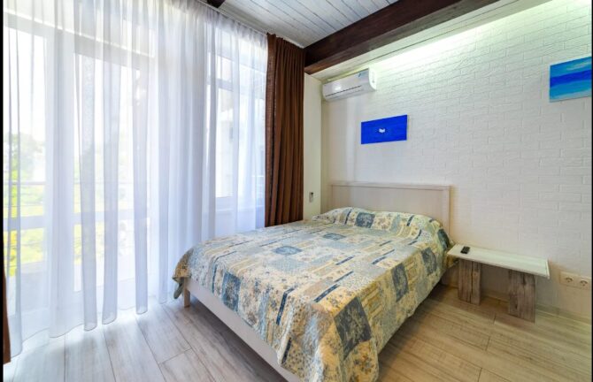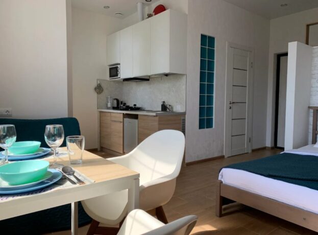 В 10 минутах ходьбы от пляжа расположена небольшая студия, оформленная в стиле Лофт. В квартире площадью 25 кв. м могут комфортно разместиться 2 гостя. Для сна установлена широкая кровать, обеденная зона компактно размещена возле стены, во встроенной кухне имеется техника для приготовления и хранения пищи. Из панорамных окон открывается вид на дендропарк «Южные культуры». это прекрасное место для прогулок с многочисленными лестницами, смотровыми площадками, элегантными мостиками.