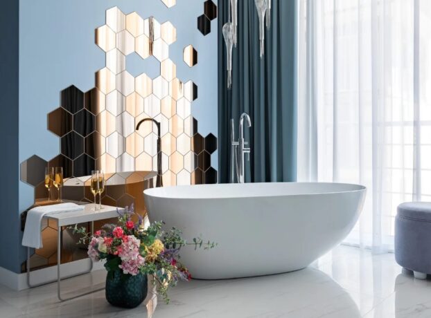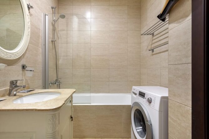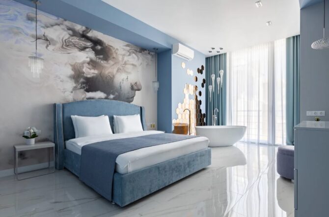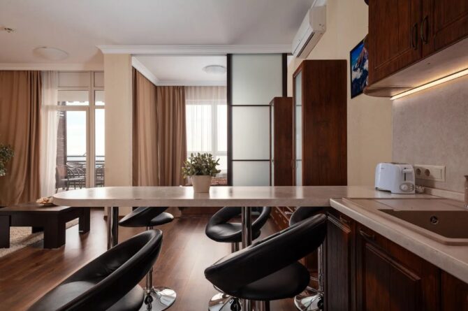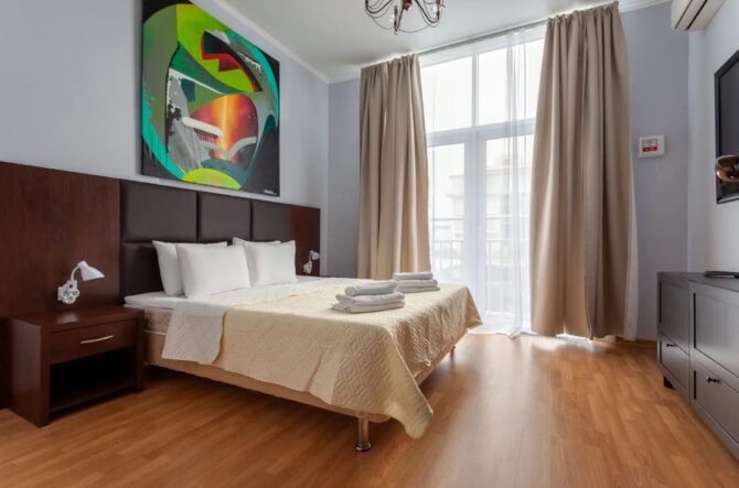 Прекрасно оформленная квартира понравится эстетам. Кроме просторной гостиной здесь имеются две отдельные спальни. В одной из них установлена ванна напротив панорамного окна. Это жилье предпочитают снимать молодые супруги, романтики и любители расслабляющего отдыха после насыщенного дня. Также отмечается удобное расположение дома. Рядом море, парк, развлекательные объекты, остановки общественного транспорта. По дороге на пляж «Бархатные сезоны» (250 м от дома) можно полюбоваться фонтаном Дружбы народов или посидеть в кафе.
