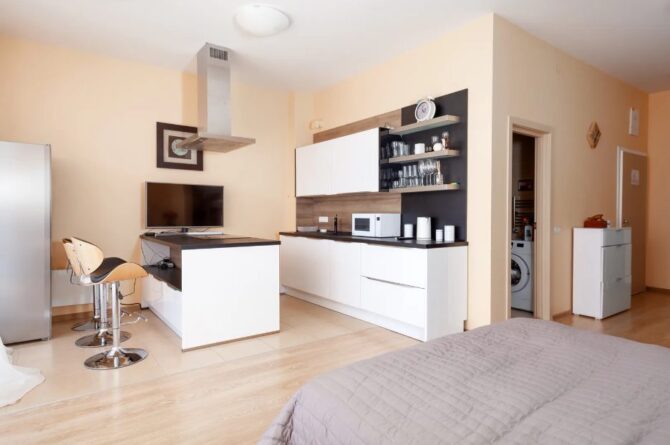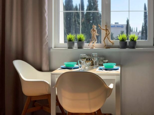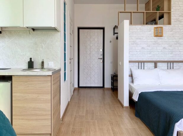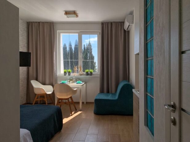Уютная студия с дизайнерским ремонтом находится в жилом комплексе «Арт Лайт Сити». Здесь могут поселиться максимум 3 человека. Из окна квартиры, расположенной на 4-м этаже, открывается вид на участок с кипарисами. Отсюда появилось и название апартамента. Балкона нет. Владельцы по максимуму облегчили заезд и размещение отдыхающих, предоставив возможность бесконтактного заселения. Приехать сюда можно в любое удобное время, получив код для электронного замка.