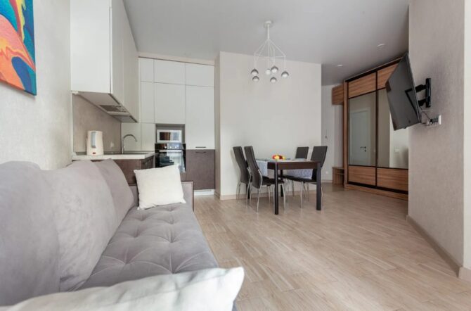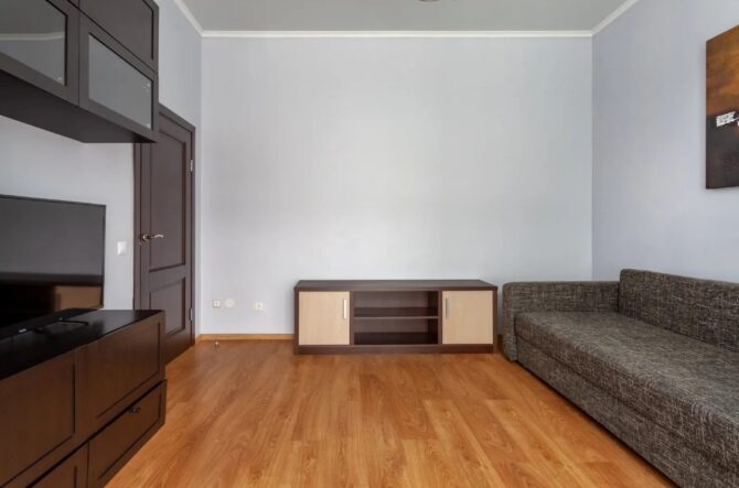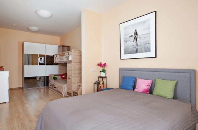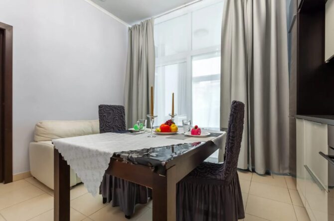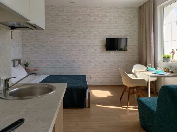 В том же доме можно арендовать квартиру большей площади, в которой могут комфортно разместиться до 4-х гостей. Спальня находится отдельно от гостиной. В качестве дополнительных спальных мест предусмотрен диван. Можно приезжать с животными. Несмотря на то, что жилье расположено на 1-м этаже, имеется терраса с видом на улицу. Во дворе построена детская игровая площадка, рядом с домом работает пункт проката велосипедов.
