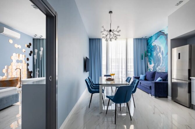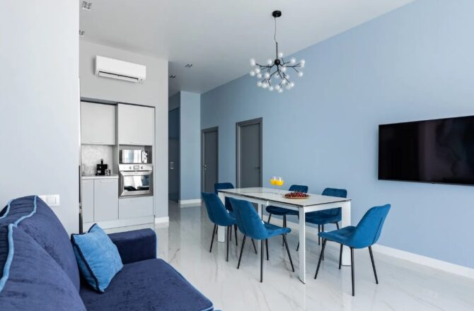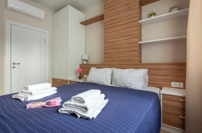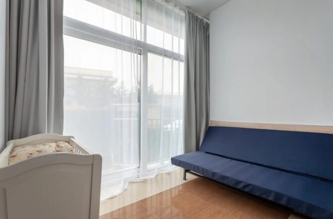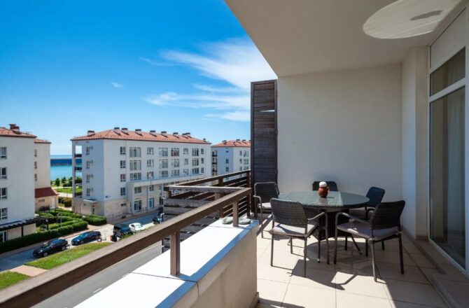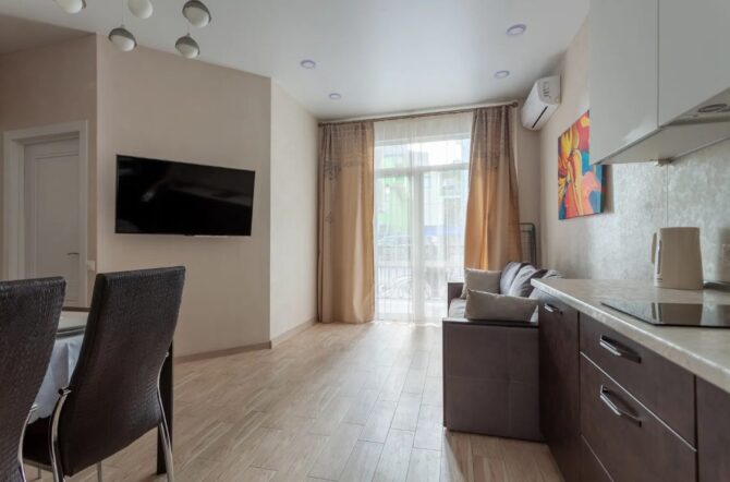 В 3‑комнатной квартире с двумя отдельными спальнями могут разместиться до 9 гостей. Это жилье нравится отдыхающим, так как оно расположено на 1-м этаже и имеет выход в собственный зеленый дворик. В качестве удобств предусмотрено 2 санузла, один из них с душем, полностью укомплектованная встроенная кухня. Мебель красивая и новая. Для малышей имеется кроватка (не манеж). Дом находится на первой береговой линии рядом с Олимпийским парком. Можно заселяться с домашними животными.