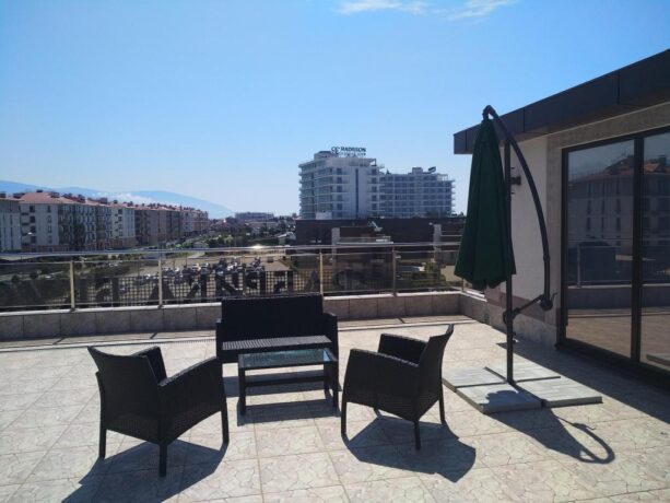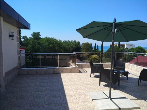 Просторный пентхаус на 5-м этаже пятиэтажного дома рассчитан на проживание 4-х гостей, в частности, родителей с двумя детьми. Для взрослых установлена двуспальная кровать, для детей – двухуровневая. Жилье находится в элитном жилом комплексе «Имеретинский». Санузел совмещенный, с ванной и стиральной машиной. Из окон открывается вид на море. расстояние до ближайшего пляжа составляет 190 м. во дворе установлены 2 бассейна – детский и взрослый, с террасой для загара. Территория огорожена, находится под охраной. Двор озеленен, проложены прогулочные дорожки.