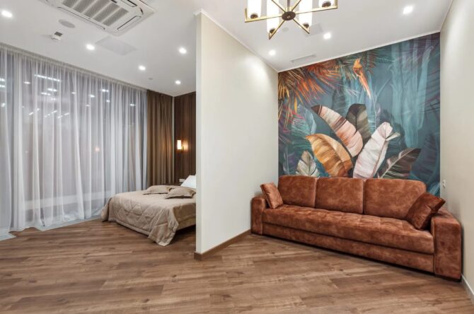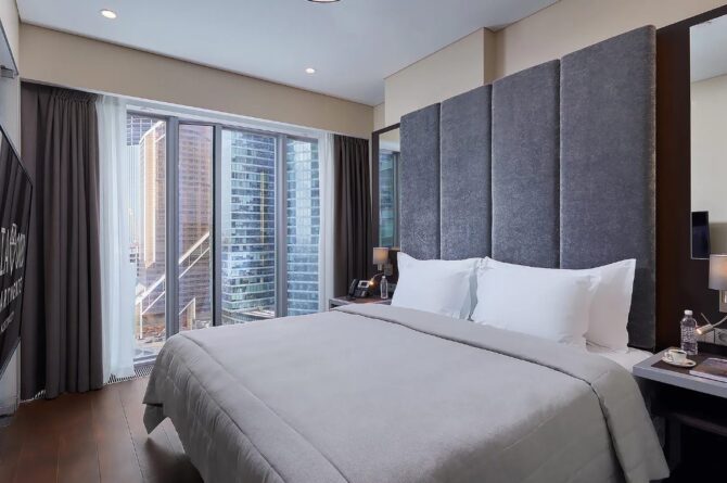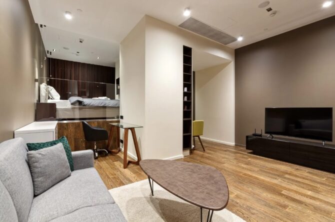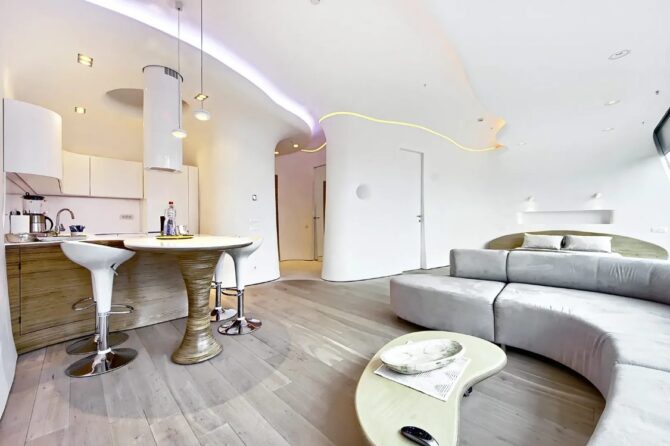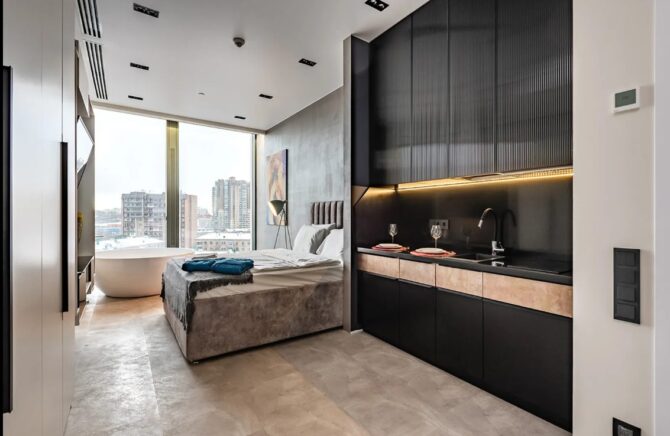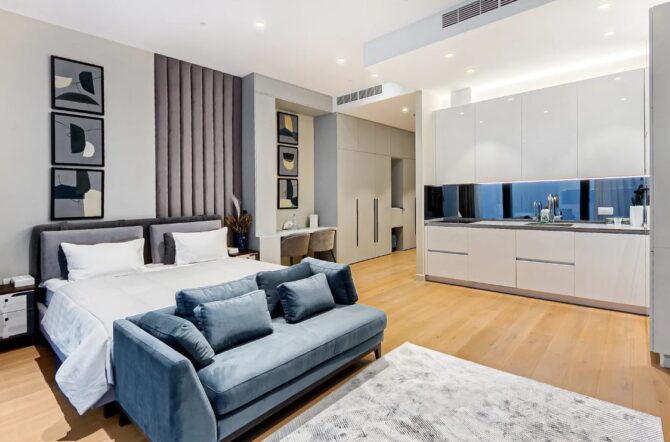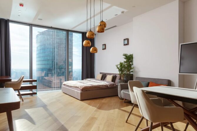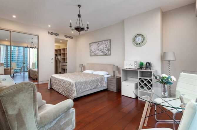 Элитные апартаменты с авторским дизайном расположена на 57-м этаже небоскреба «Империя». Для оформления помещения был выбран элитный стиль Hi-end. Он предполагает интересные световые решения и особую акустику, получаемую за счет планировки, материалов отделки и мебели. Студия визуально разделена на 3 зоны – спальню, лаундж, кухню с оригинальной барной стойкой. Для одежды и вещей предусмотрена отдельная гардеробная. В ванной комнате установлена многофункциональная душевая кабина, умывальник, стиральная машина и унитаз. В стоимость проживания включено круглосуточное обслуживание в номере, доставка еды и напитков, уборка и чистка.