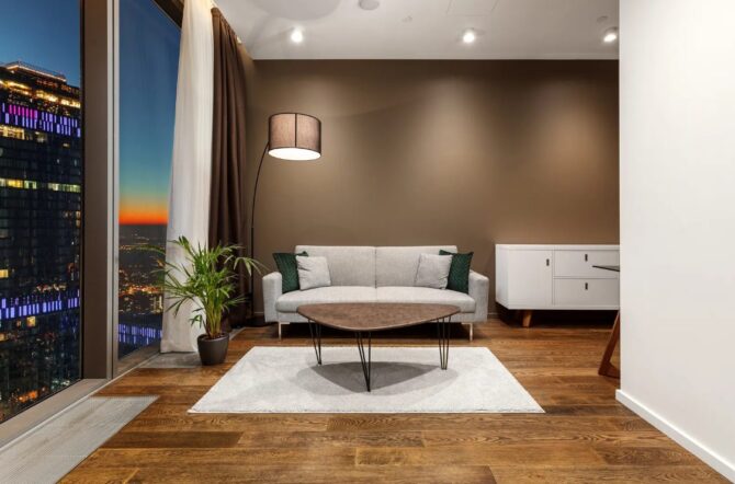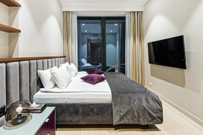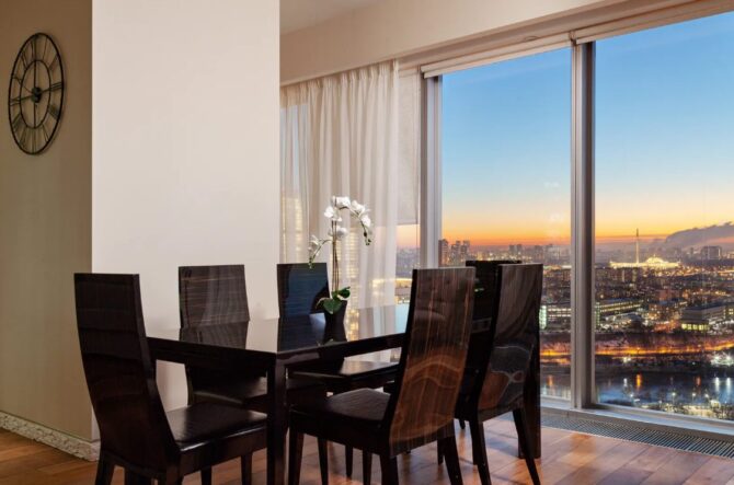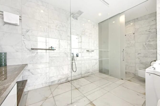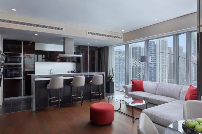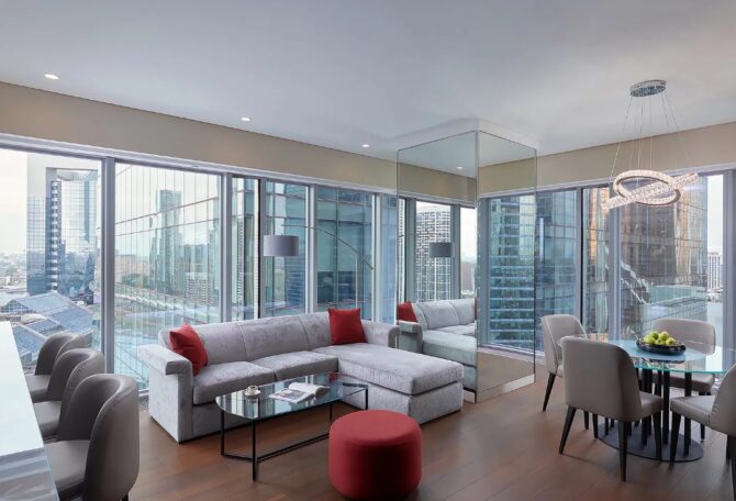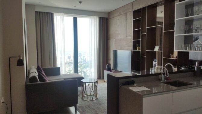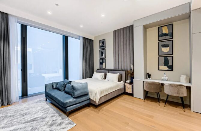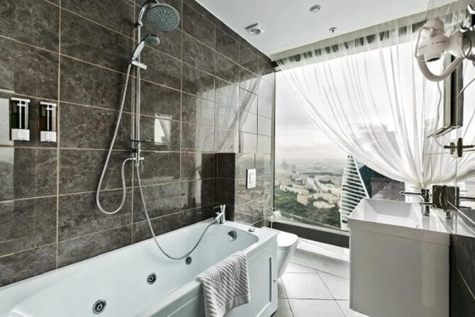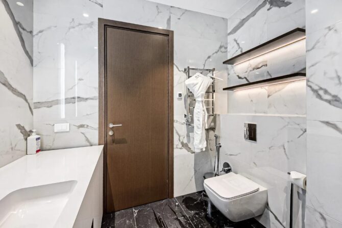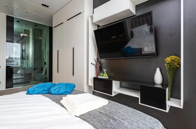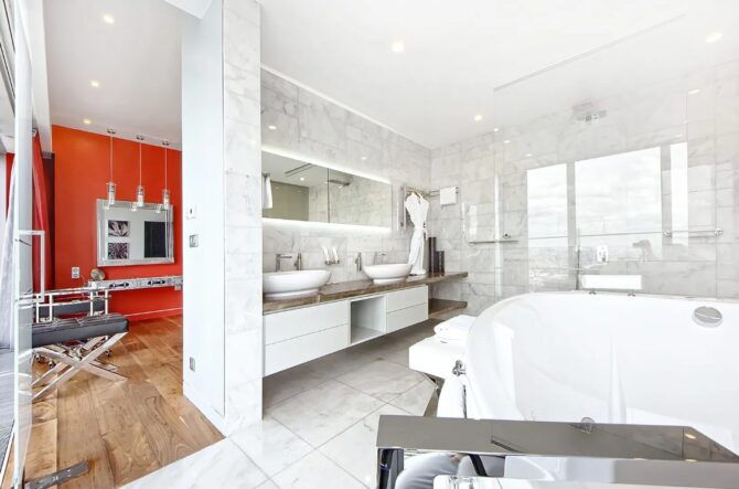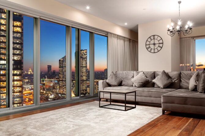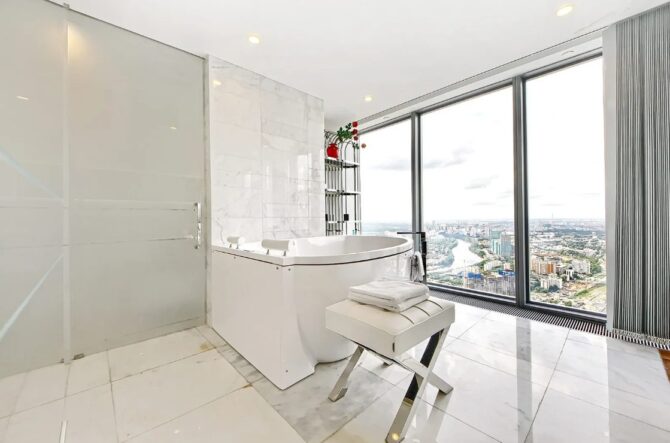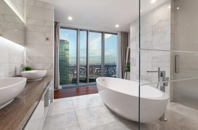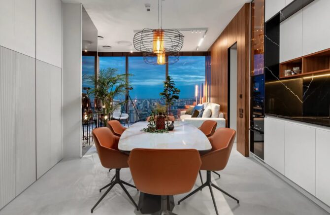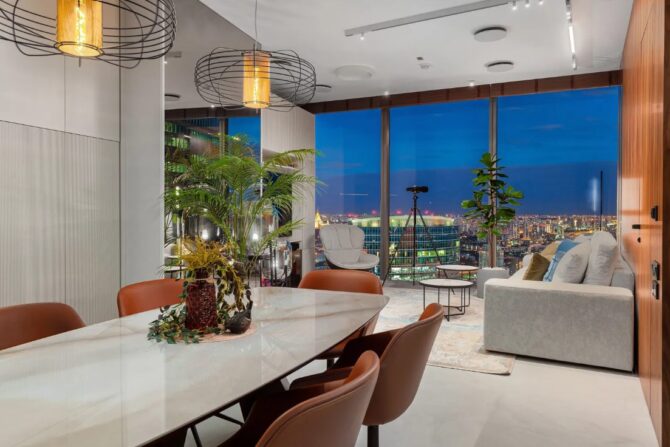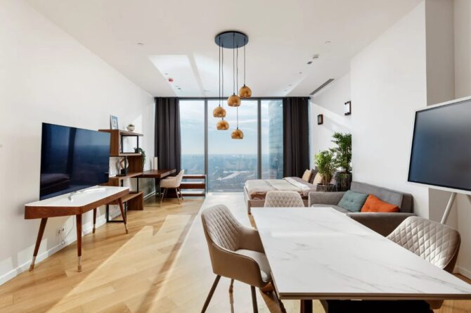 Апартаменты пользуются спросом благодаря уникальному панорамному остеклению. Квартира занимает торец здания, поэтому две стены гостиной полностью состоят из стекла. Комната визуально разбита на обеденную зону и лаундж. В спальне кровать также установлена у панорамного окна. От лучей яркого утреннего солнца защищают плотные шторы. Санузел с ванной не видовой. Это обычное помещение, отделанное мраморной плиткой. Туалет для гостей находится в прихожей.