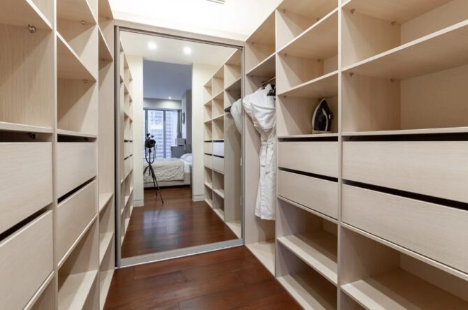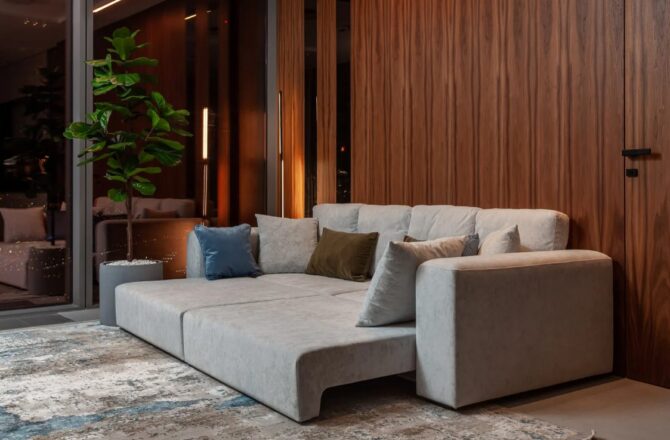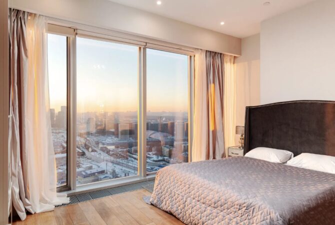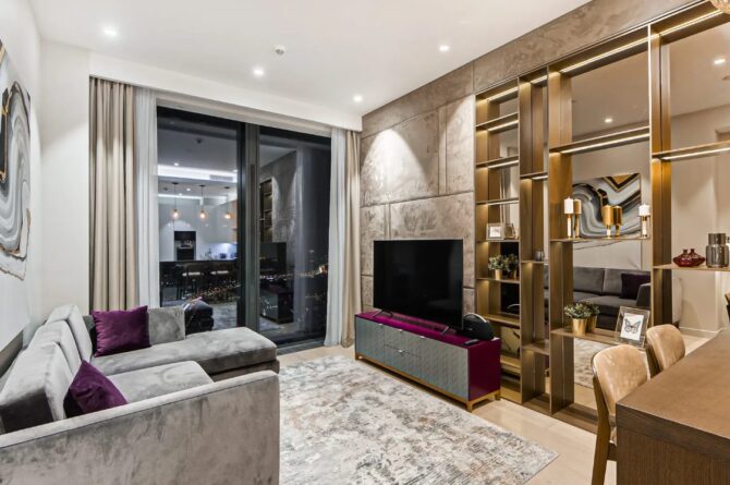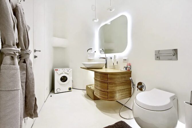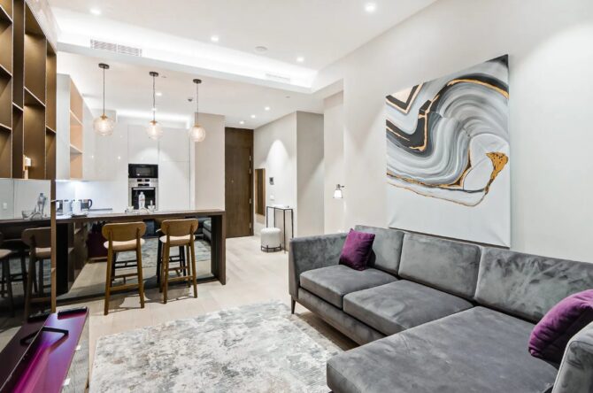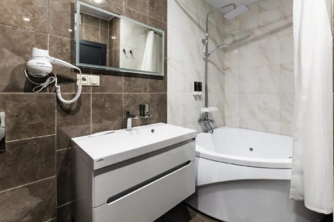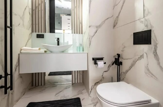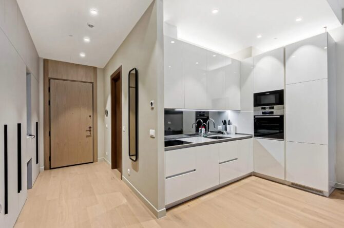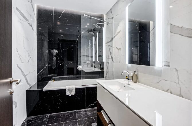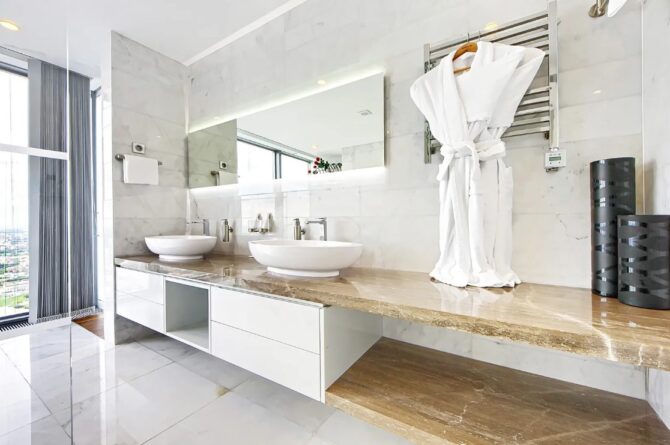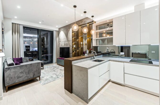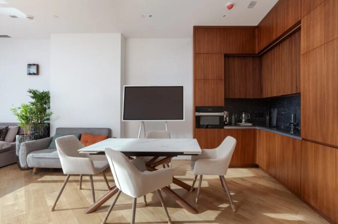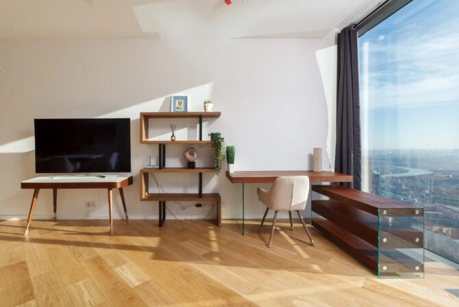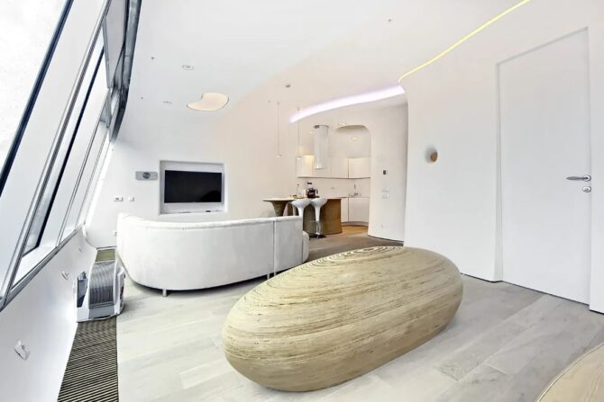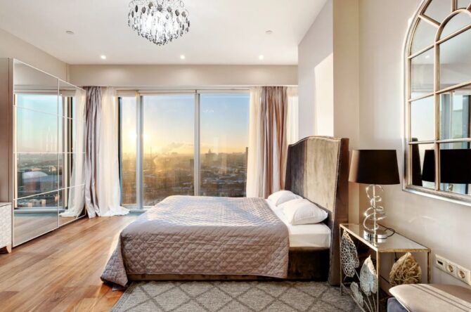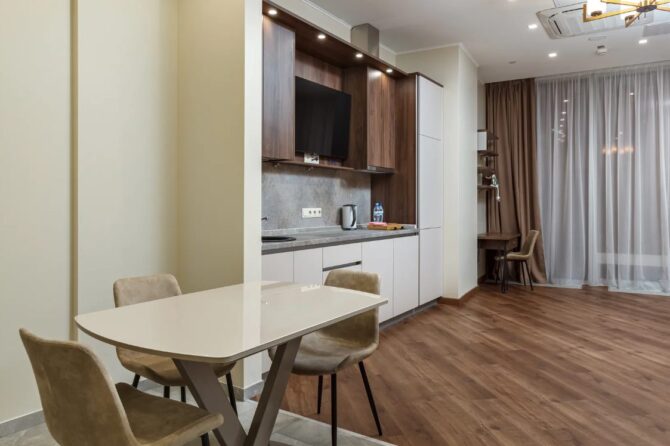 Апартаменты пользуются спросом благодаря уникальному панорамному остеклению. Квартира занимает торец здания, поэтому две стены гостиной полностью состоят из стекла. Комната визуально разбита на обеденную зону и лаундж. В спальне кровать также установлена у панорамного окна. От лучей яркого утреннего солнца защищают плотные шторы. Санузел с ванной не видовой. Это обычное помещение, отделанное мраморной плиткой. Туалет для гостей находится в прихожей.