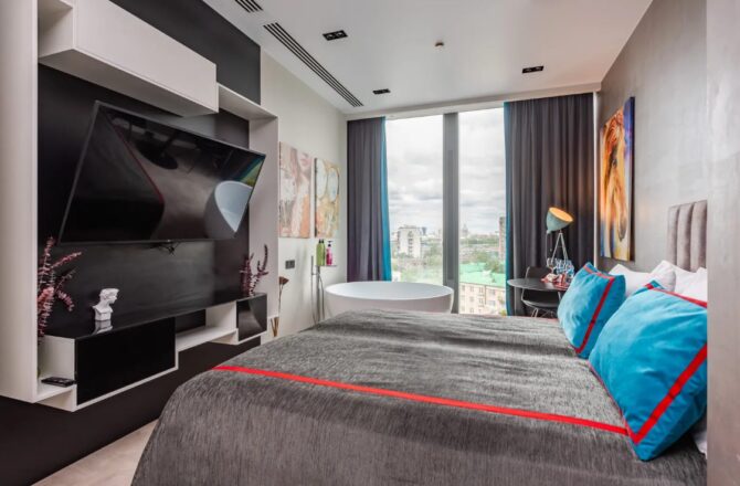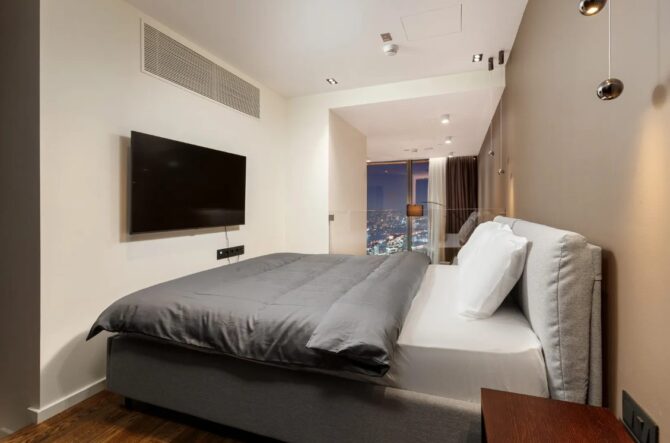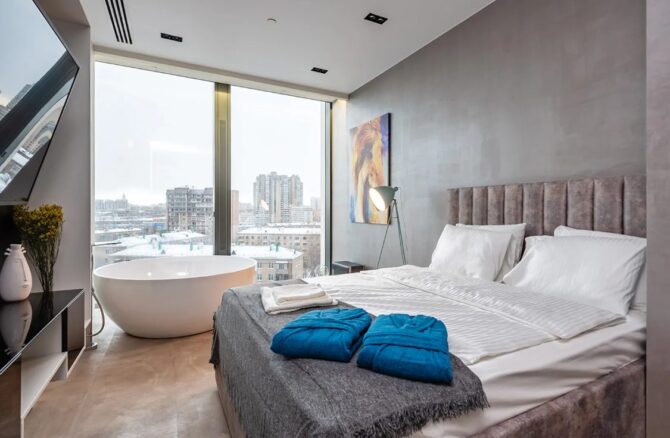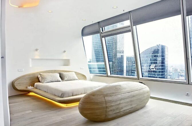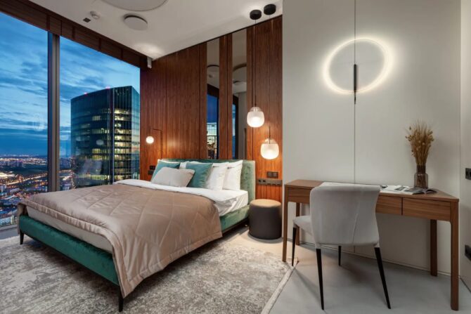 Однокомнатная квартира находится на 51-м этаже башни «ОКО». Превосходный интерьер, сделанный в постмодернистском дизайне, полностью отвечает запросам современного человека в красоте и эстетике. Здесь можно насладиться панорамным видом на Москву, принимая ванну, или с чашечкой кофе за журнальным столиком. Владельцы эффективно использовали видовые возможности окон, расположив перед ними мини-лаунджи. Комната визуально разбита на несколько зон, включающих спальню и гостиную. Гардеробная комната обустроена отдельно и имеет выход непосредственно из жилого участка. Хозяева апартаментов позаботились, чтобы у каждого гостя был свой халат, тапочки и принадлежности для личной гигиены.