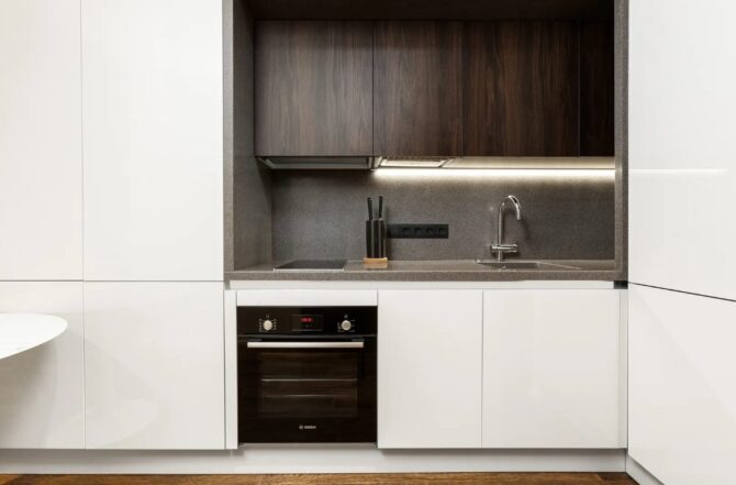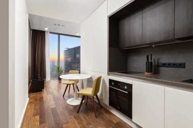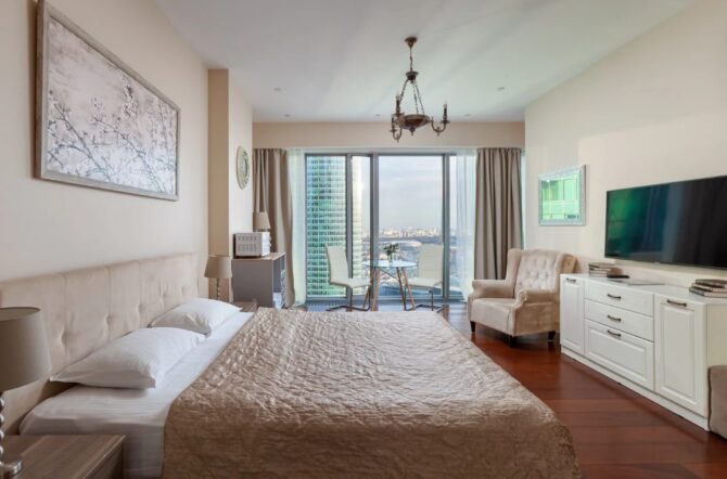 Просторные двухкомнатные апартаменты расположены на 28 этаже башни «ОКО». Из панорамных окон открывается вид на небоскребы Москва-сити и парк Победы. Паркинг предоставляется по запросу. В стоимость проживания включены набор гигиенических принадлежностей, халат, тапочки, чай, кофе. Приготовить поесть можно на собственной кухне, заказать по телефону доставку еды или отправиться в один из ресторанов башни – Ruski на 84-м этаже, Six Voice на 6-м. На территории здания также открыт фитнес-зал. Элитный СПА с бассейном находится на крыше соседней башни Федерация.