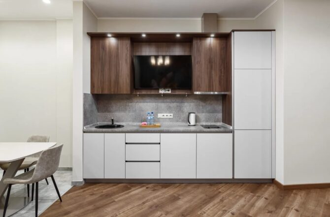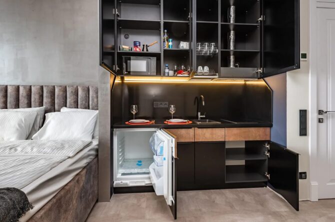 Для отдыха предусмотрены телевизор со спутниковыми каналами, музыкальный центр. Утром можно самостоятельно сварить себе кофе и приготовить тосты. Для приготовления обеда и ужина предусмотрена вся необходимая техника: плита с духовым шкафом, посуда и столовые принадлежности. Для хранения продуктов питания имеется холодильник с морозильной камерой. В квартире имеется встроенный сейф, в котором можно безопасно хранить ценные вещи и документы.