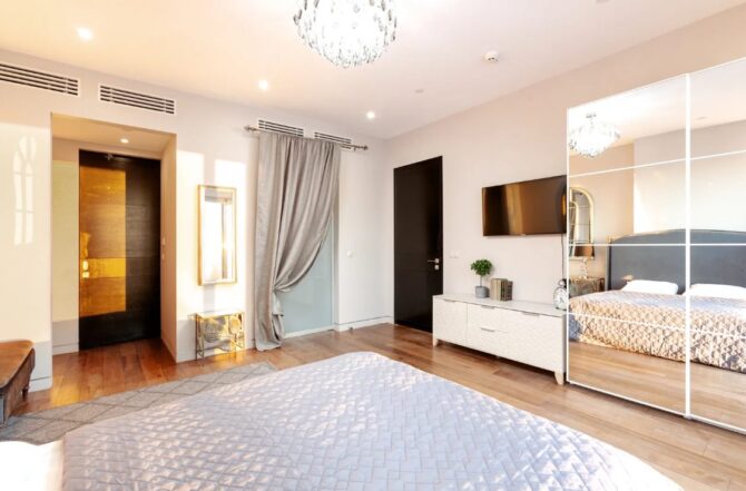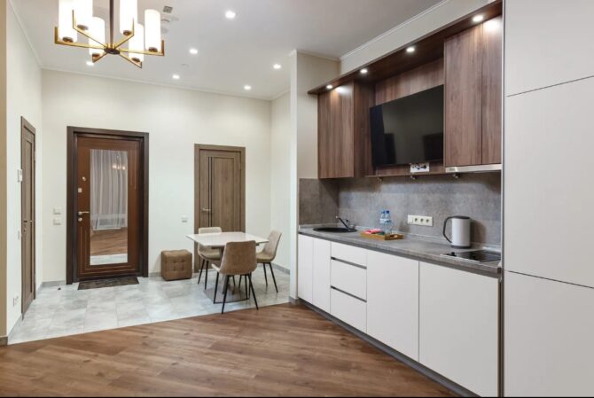 На том же этаже находятся еще один апартамент, пользующийся спросом у компании друзей или семьи из 5 человек. Владельцы предлагают условия проживания премиум-класса. В квартире выполнен дизайнерский ремонт. Она удобно разделена на несколько зон с помощью перегородок. В результате, к услугам гостей: две полноценные двуспальные кровати плюс диван в гостиной для 5-го человека, система «теплых полов», камин в гостиной с 3D эффектом, СМАРТ-ТВ с 75-дюймовым экраном, кондиционер, деревянные жалюзи на окнах. На встроенной кухне предусмотрен полный комплект бытовой техники, в том числе ледогенератор и кофемашина.