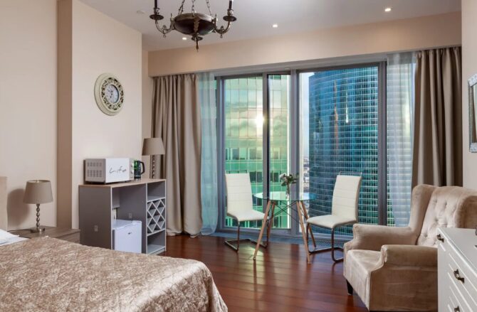 Очень небольшая студия с возможностью проживания 2-х человек расположена на 7-м этаже башни «Нева». В комнате проведен дизайнерский ремонт, в результате которого она превратилась в жилое помещение, где все находится под рукой: просторная кровать с плазменной теле-панелью напротив, журнальный столик с напольным торшером для чтения книг, удобная ванна с панорамным видом на Москву. За стеклянной стеной находится санузел с душевой кабиной. Кухонный уголок элегантно встроен в стену рядом с прихожей. В нем предусмотрены: мини-холодильник, чайная станция, умывальник, плита, микроволновая печь. Духового шкафа нет. Посуды хватит на двоих.
