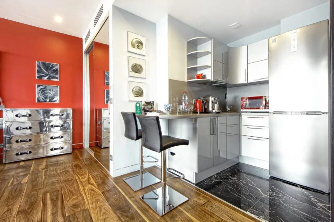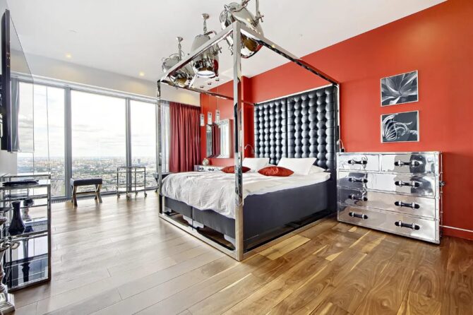 Эта студия больше подойдет для творческих натур, стремящимся к экспериментам и разнообразию. Владельцы, в свою очередь, утверждают, что это отличный вариант проживания с детьми. На вкус и цвет товарищей нет, поэтому немного об объекте. Однокомнатный апартамент расположен на 63-м этаже башни «ОКО». Из панорамных окон открывается вид на западную часть Москвы. Дизайнеры создали интересный интерьер, используя контрастные цвета – красный и металлик. За счет игры света на отражающих поверхностях от установленных над кроватью прожекторов, вечером создается особая атмосфера. Она располагает к творческим поискам как-то разнообразить текущий вечер.