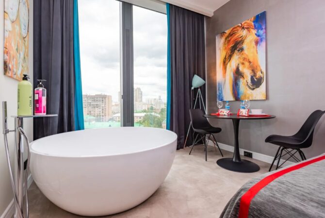 Расположившись в этих апартаментах, можно больше никуда не ходить и не искать развлечений. Здесь предусмотрены: винный шкаф для напитков, игровая приставка для видеоигр, настольные игры для компании, профессиональный караоке с саунд-системой, бинокль с 40-кратным увеличением, чтобы в деталях рассмотреть близлежащие исторические объекты Москвы. Вся инфраструктура Москва-сити в полном распоряжении постояльцев. Можно отправиться по магазинам, прогуляться по набережной или поужинать в одном из многочисленных ресторанов.