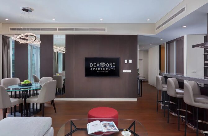 На территории делового района Москва-сити свои услуги предоставляет апарт-отель «Даймонд». Он расположен в башне «ОКО». Это пока единственный московский гостиничный комплекс, обеспечивающий обслуживание в категории 5 звезд. В сервис входит не только размещение гостей столицы в комфортные квартиры, но и обеспечение их питанием. Завтрак, обед и ужин заказывается по меню, оплачивается отдельно. Еду могут доставить в номер по требованию гостя. В фонде – 65 номеров. Каждая комната оснащена панорамными окнами, предусмотрены рабочая и лаундж зоны, встроенная кухня с островом. Чем дольше проживает гость, чем он меньше платить за сутки. Это политика отеля, принимающего в основном людей, приезжающих в столицу по делам.