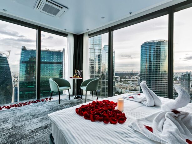 Мини-отель, расположенный в башне «Федерация», также принимает бизнесменов, но больше ориентируется на романтически настроенные пары. Апартаменты занимают угловую часть 53-го этажа и являются полностью панорамными. Здесь любят проводить медовый месяц новобрачные. Ничто не мешает им просыпаться с видом на Москву, принимать ванну с панорамой на близстоящие небоскребы, которые ночью расцвечены всеми цветами радуги. Отель прилагает питание, парковку и массу интересных мест для посещения. В районе создана лучшая инфраструктура, включающая в себя фитнес-залы, салоны красоты, рестораны премиум класса. В фонде пока всего 2 номера. Один рассчитан на проживание 2-х гостей, во втором можно заселиться троем.