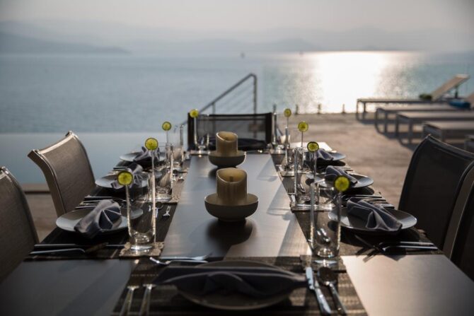 Кухня обставлена необходимой техникой, что позволяет самостоятельно приготавливать пищу. Трапезничать можно в доме за столом или на крытой веранде. За дополнительную плату посетители могут сделать заказ на доставку продуктов, еды, напитков в номер, расслабляющие процедуры. Преимуществом виллы Manta является частная пляжная зона. Недавние посетители отмечают приветливость и отзывчивость персонала, красивый дизайн здания и местность.