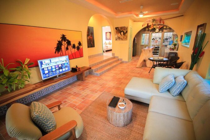 Отдыхающие могут разместиться в 3 спальнях с кондиционерами. В зале установлен удобный диван и телевизор с плазменной панелью. Небольшая кухонная зона оборудована плитой и обеденным столом. Парковочные места на территории отсутствуют, трансфер осуществляется за плату. Администрация не допускает размещение детей и домашних животных.